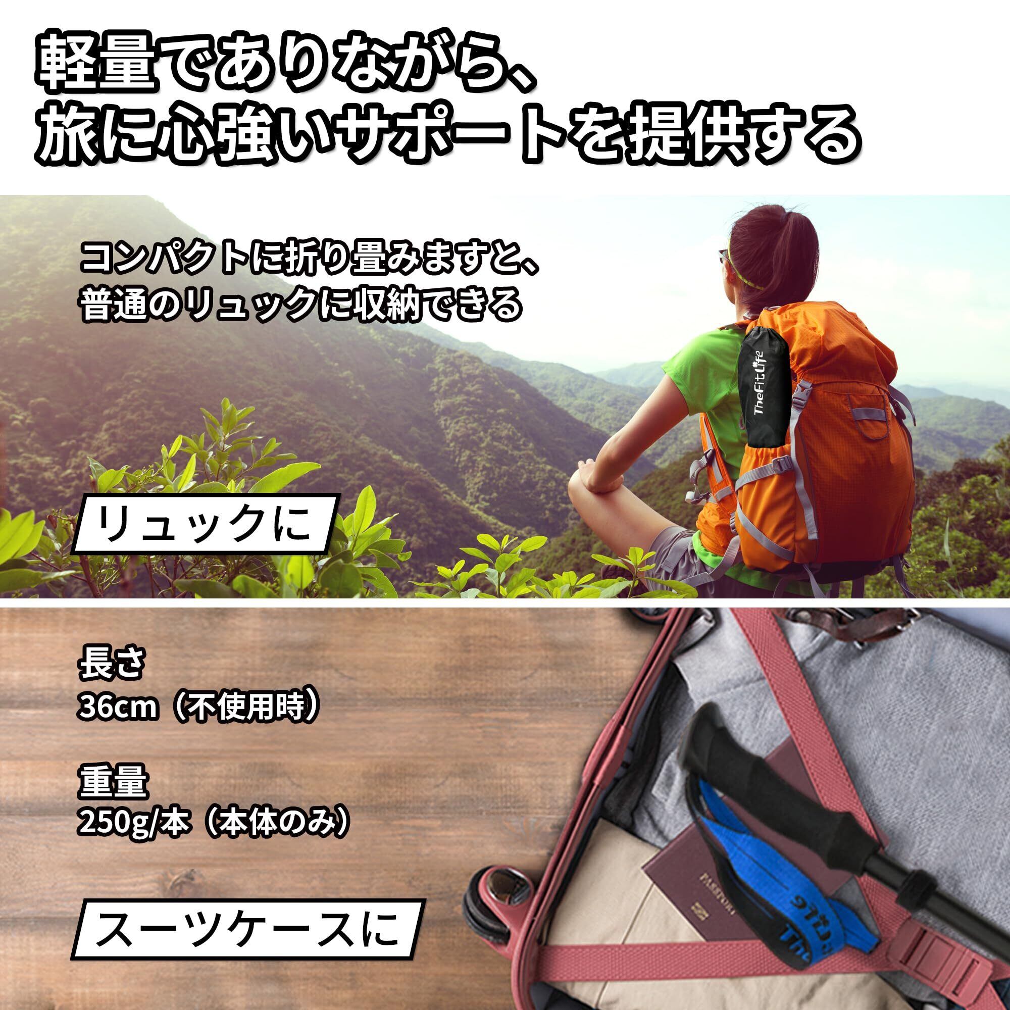 【ポールは軽いほど良い】軽いポールを使用することで、腕が疲れにくくなります。TheFitLifeの折畳み式のトレッキングポール1本の重量はわずか0.25kgですので(本体のみ)、長い距離の登山にはずいぶん役が立っています。ポールが軽ければ、体力回復しながら長い距離を歩けることは遥かに簡単になります。