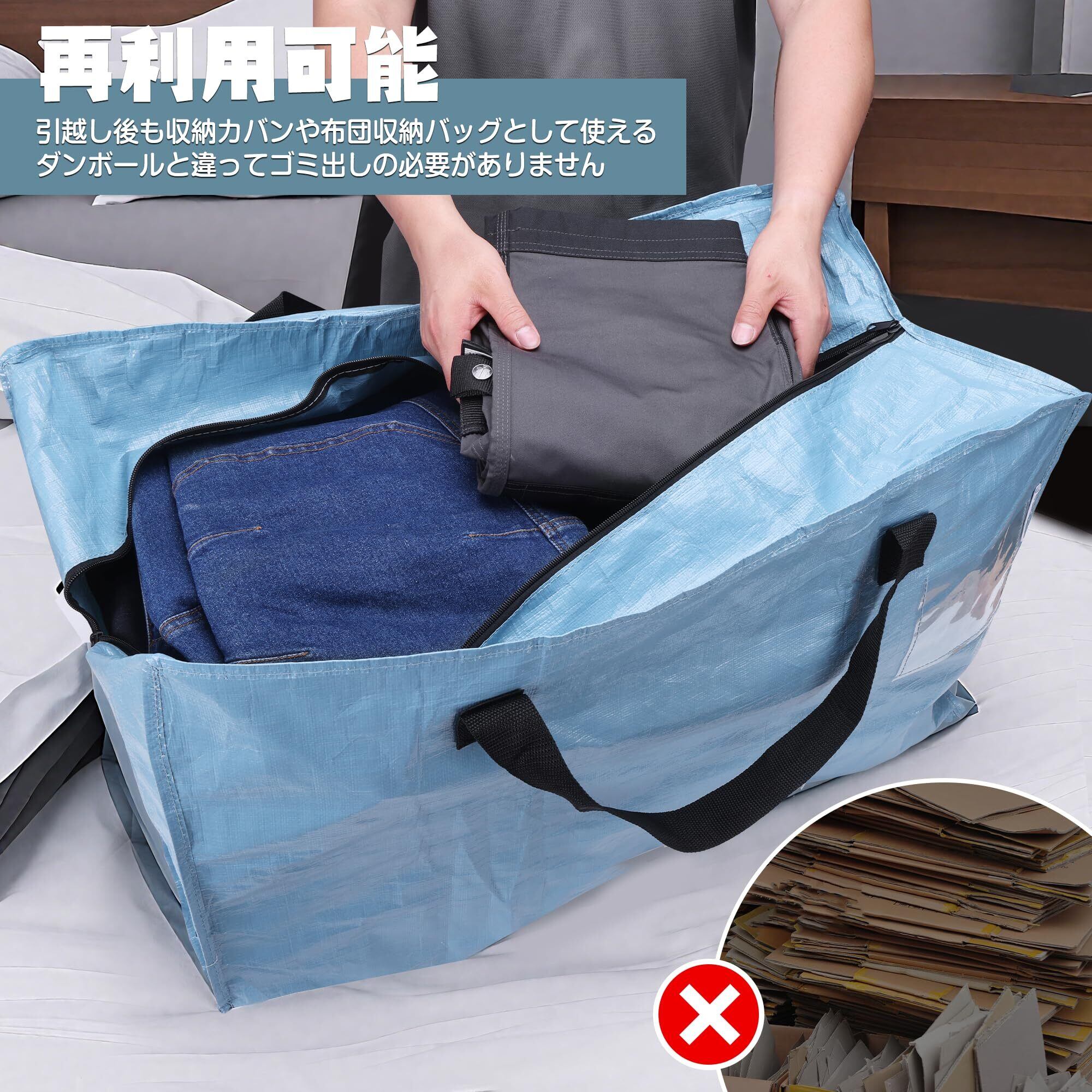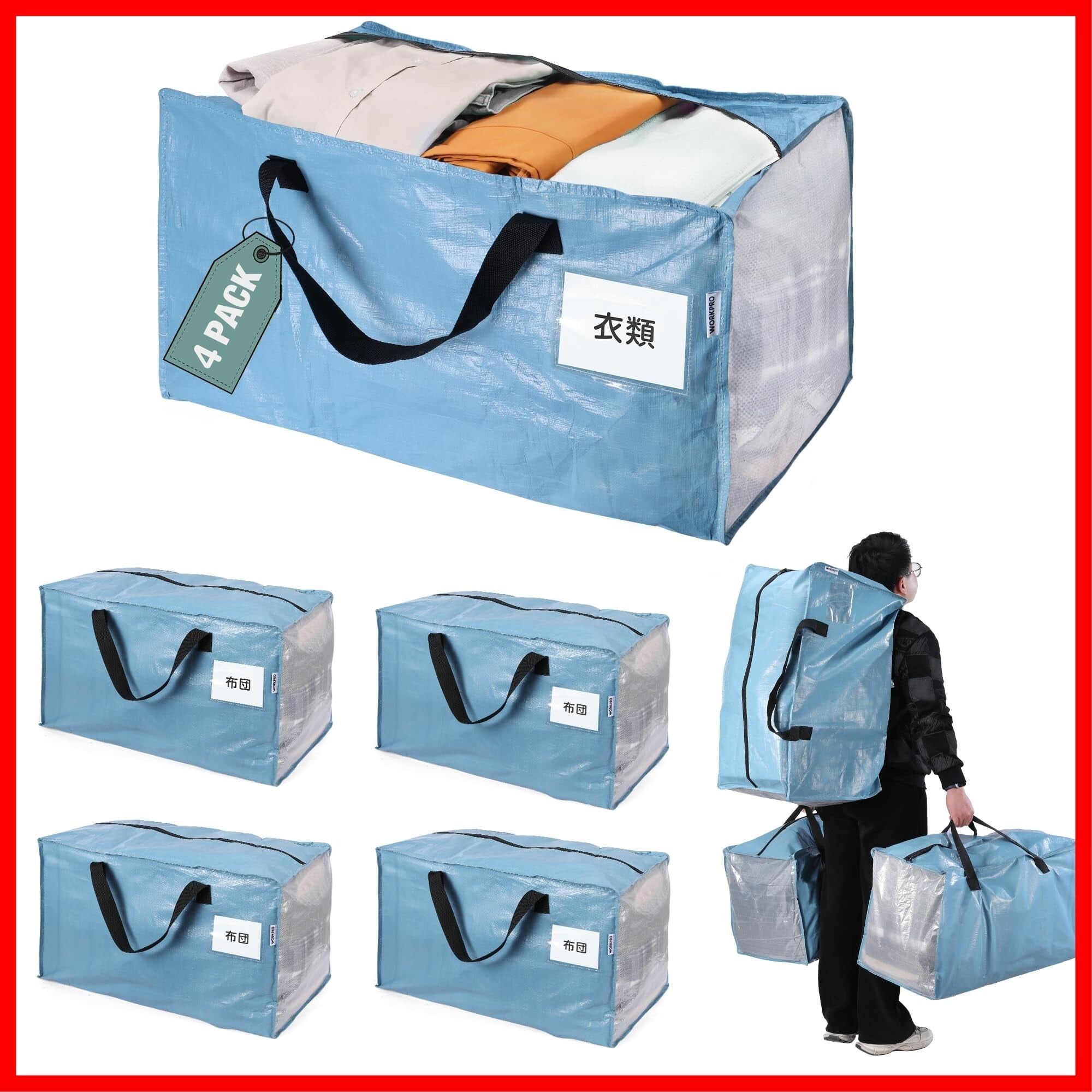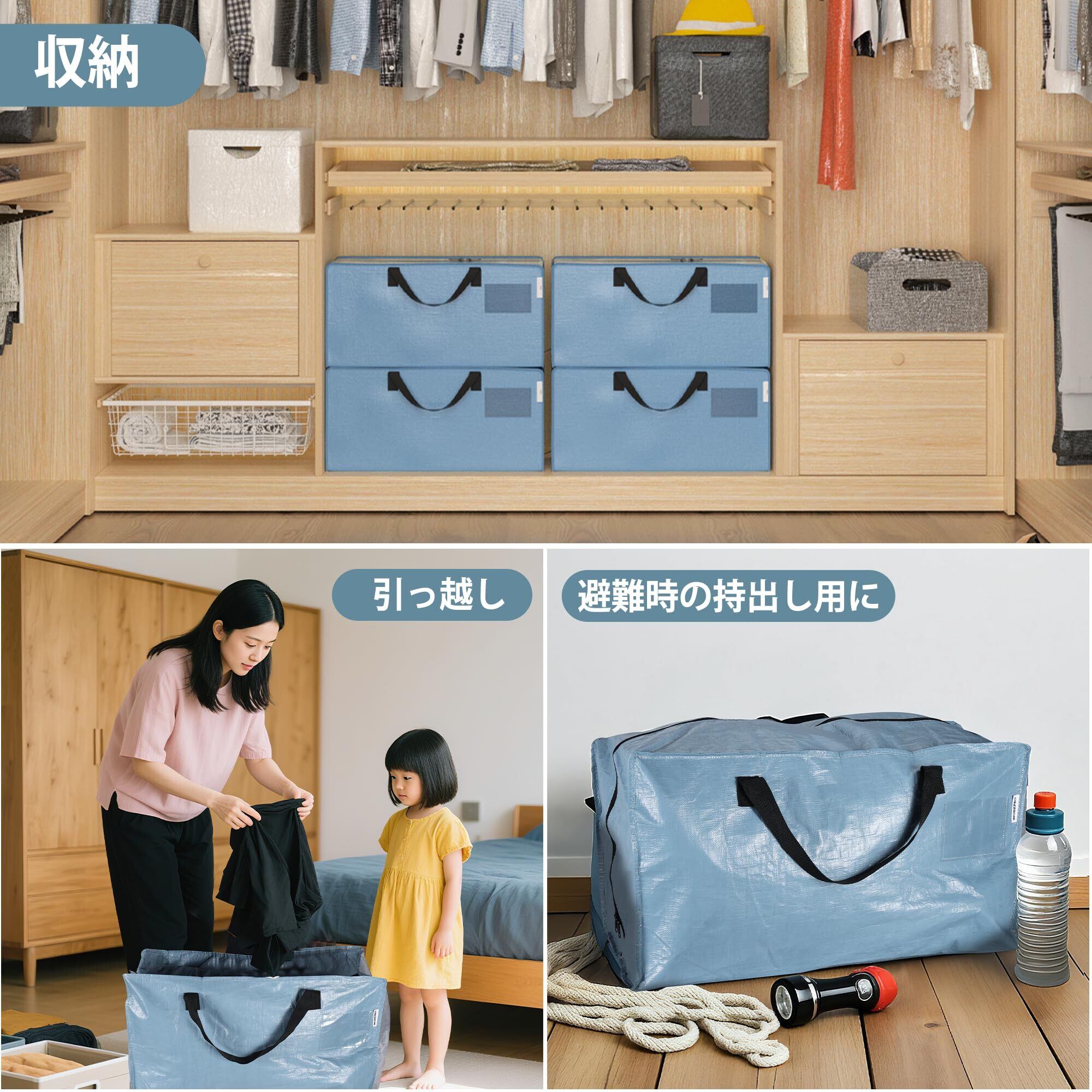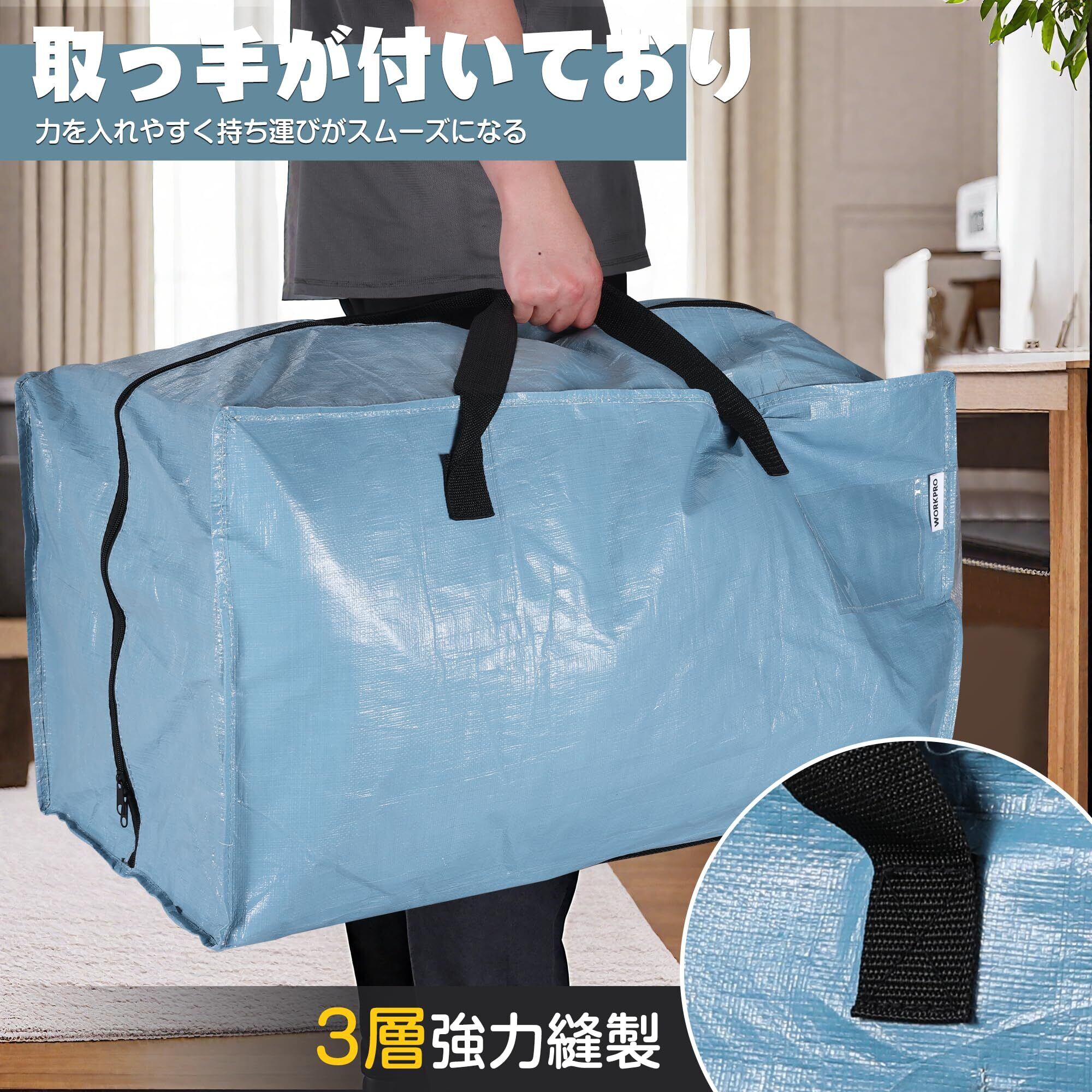 WORKPRO 布団収納バッグ 引越しバッグ 大型収納袋 大型収納カバン 100L大容量 73*36*40CM 耐荷重22.7KG 背負える仕様 持ち手付き 布団収納袋 衣類収納袋 透明窓 防塵 防水 引っ越し キャンプ 旅行 収納用 4枚セット | hananoki
