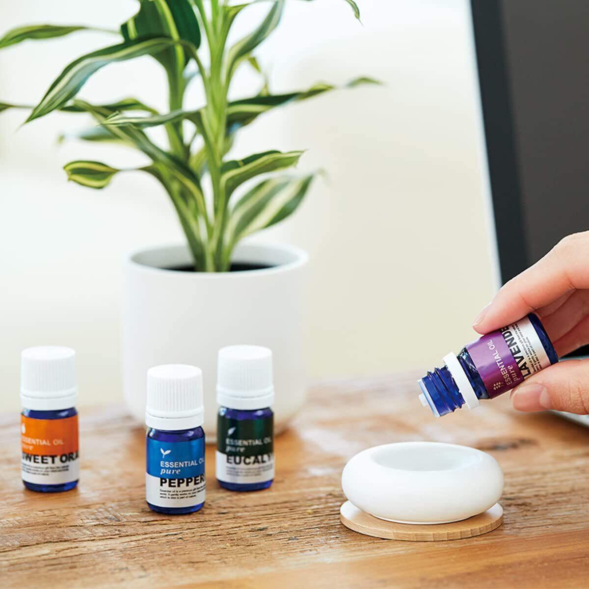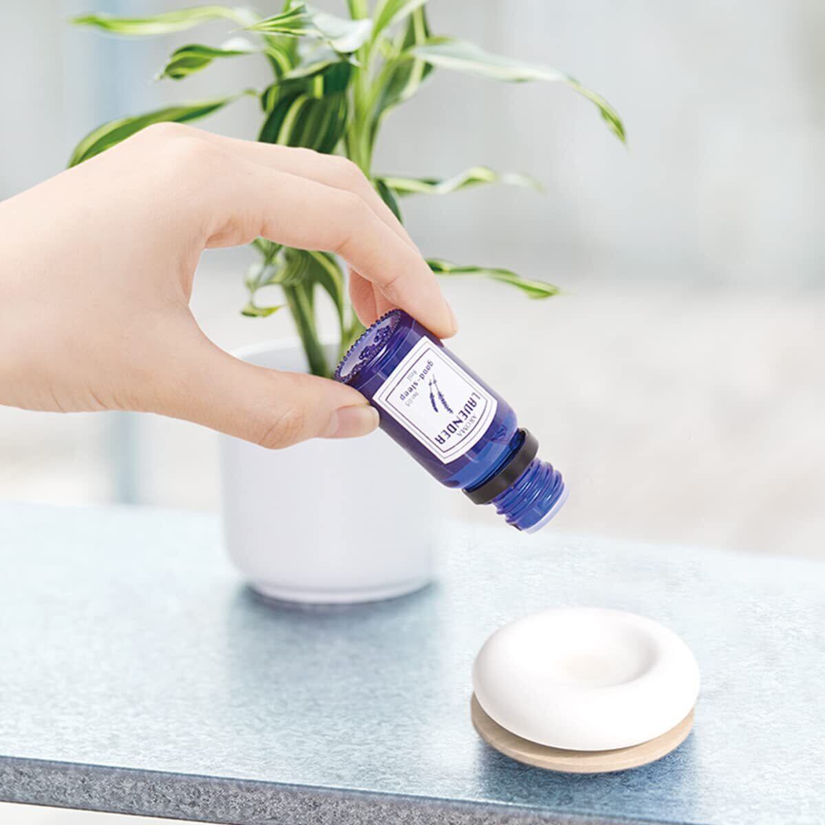 ●本体を付属のコースターに置き、中央のくぼみにエッセンシャルオイルやアロマオイルを直接2~5滴垂らし、香りをお楽しみください。