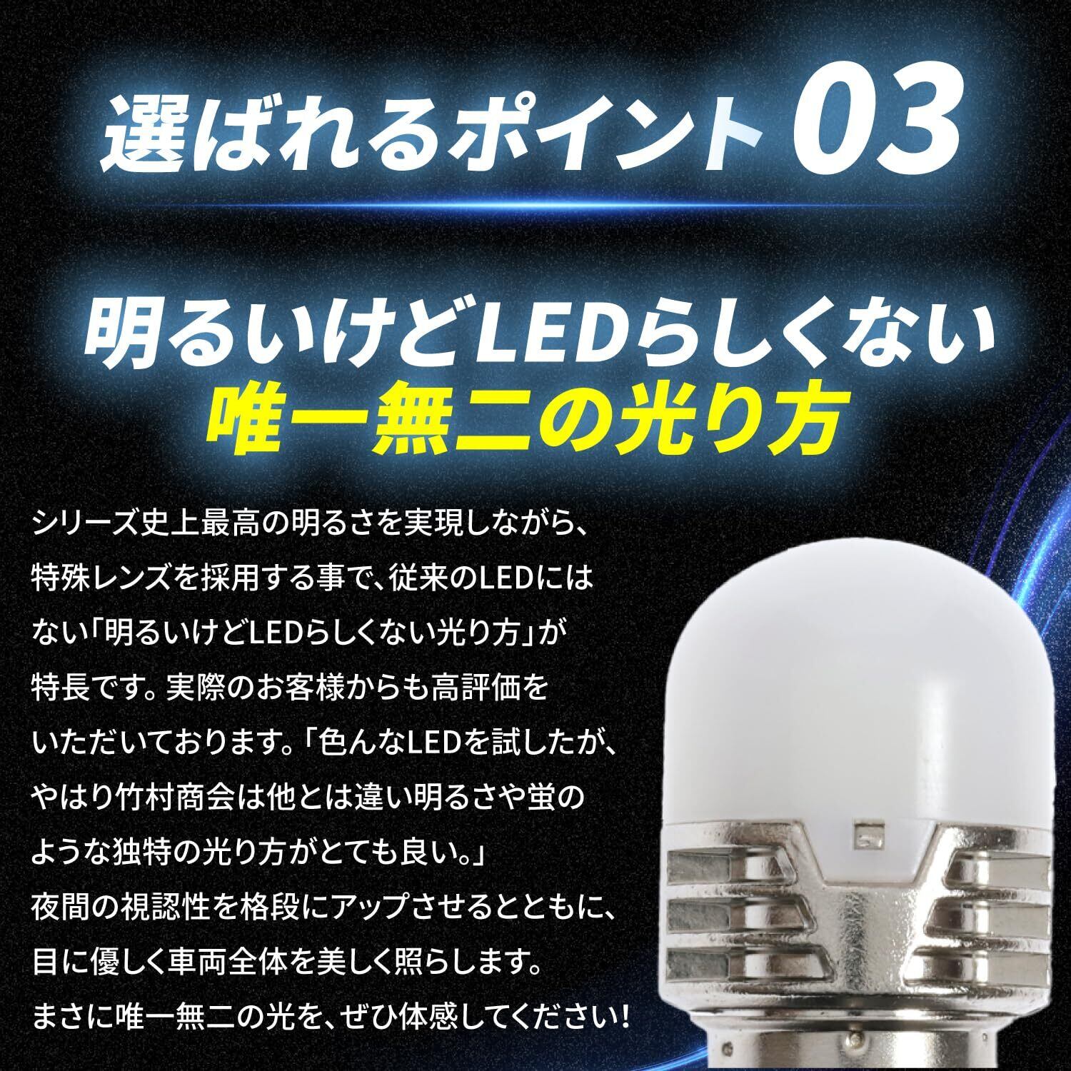 【明るいけどLEDらしくない唯一無二の光り方】 シリーズ史上最高の明るさを実現しながら、特殊レンズを採用する事で、 従来のLEDにはない「明るいけどLEDらしくない光り方」が特長です。 実際のお客様からも高評価をいただいております。 「色んなLEDを試したが、やはり竹村商会は他とは違い明るさや蛍のような独特の光り方がとても良い。」 夜間の視認性を格段にアップさせるとともに、目に優しく車両全体を美しく照らします。 まさに唯一無二の光を、ぜひ体感してください!