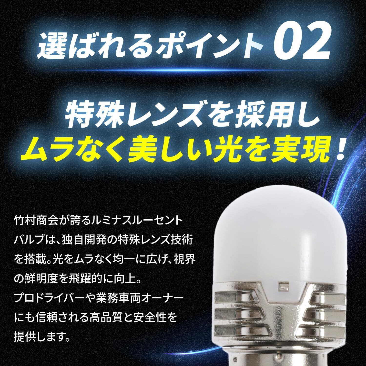 【特殊レンズを採用しムラなく美しい光を実現】 竹村商会が誇るルミナスルーセントバルブは、独自開発の特殊レンズ技術を搭載。 光をムラなく均一に広げ、視界の鮮明度を飛躍的に向上。 プロドライバーや業務車両オーナーにも信頼される高品質と安全性を提供します。 高い透明度と明るさを実現し、どんなシーンでも美しい光を提供します。