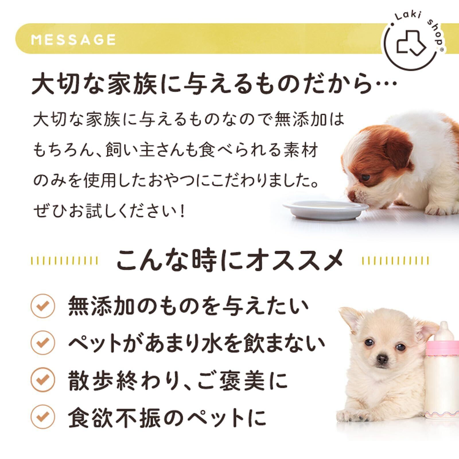 ●使用方法:体重3kg毎に付属の計量スプーン1杯分(約3g)を目安にお与えください。ミルクとして与える場合は粉ミルク1:ぬるま湯10(5g:5cc)でご使用ください。※ペットの好みに合わせて濃さを調整してください。