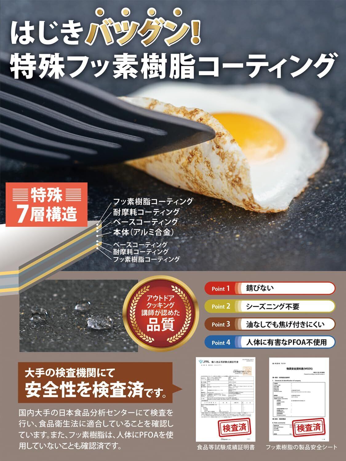 品名 アウトドア&インドア兼用マルチグリドル グリドルキング(GRIDDLE KING) 型番 FN-GK336 セット内容 本体、木製グリップ、収納バッグ、レシピ冊子 サイズ 33.6cm×42cm 重量 約750g 材質 アルミニウム合金