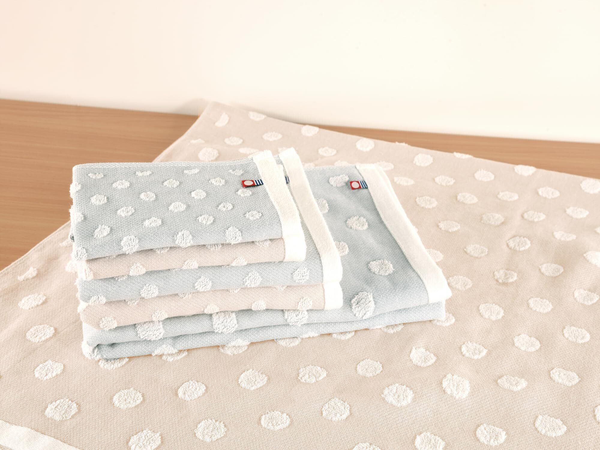 ・可愛い印象になりがちのドット柄も、落ち着きのある色をつけて、様々なシーンに合うタオルにアイテムに仕上がりました。おうちの中でも、お出かけに持っていくタオルとしても、最適なタオルです。