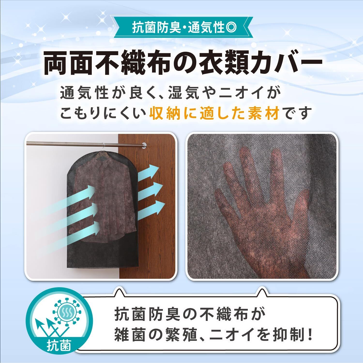 【通気性の良い不織布の衣類カバーで埃を防ぐ】:通気性が良く湿気やにおいのこもりにくい不織布製の衣類カバー。オフシーズンの衣類のほこり除けに。