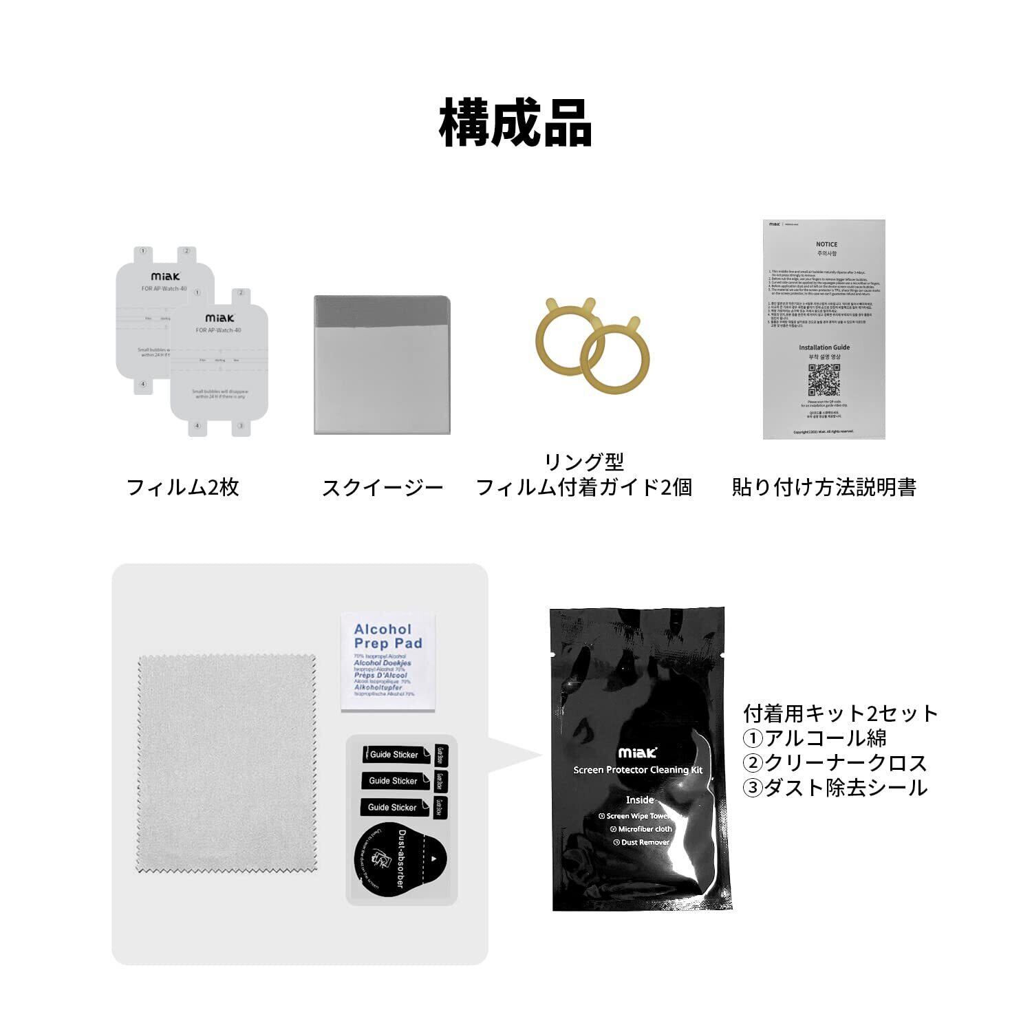 miak「セルフヒーリング 画面保護フィルム」は高透過で曲面までカバーするApple Watch専用液晶画面保護フィルムです。 ●曲面までフルカバー Apple Watch液晶の曲面まで保護します。 ●細かな傷を自己修復 フィルム表面につく細かい傷が48時間内に消える特殊コーティングが施されています。 ※修復できるのは特殊コーティング上の細かい傷のみです。すべての傷が消えるわけではありません。 ●高透過率 高い透過率でApple Watch液晶の本来の美しさを保ちます。 ●指紋防止 疎油性コーティングにより油や指紋などの汚れを防止します。 ●リング型ガイドで簡単な貼り付け 1. 静電気を防ぐためにApple Watchの電源をオフにしてください。 2. リング型付着ガイドの両側のステッカーを外して、アップルウォッチの背面に張り、平面に固定します。 ※平面は付着後、粘着が残りやすいので粘着に弱い素材には直接貼らないようにしてください。 3. ほこり除去のステッカーやクリーニングワイプを利用し、画面のほこりや異物を除去します。 4. フィルムの1番ガイドを取り外した後、フィルムを貼り付ける位置を確認し、スタートラインを押してフィルムを固定します。 5. 2番ガイドと3番ガイドを外し、スクイージーで押してフィルムを貼り付けます。 6. 最後に4番ガイドを取り除いた後、曲面部分を押します。 ※小さい気泡が入った場合、数日で自然に抜けます。