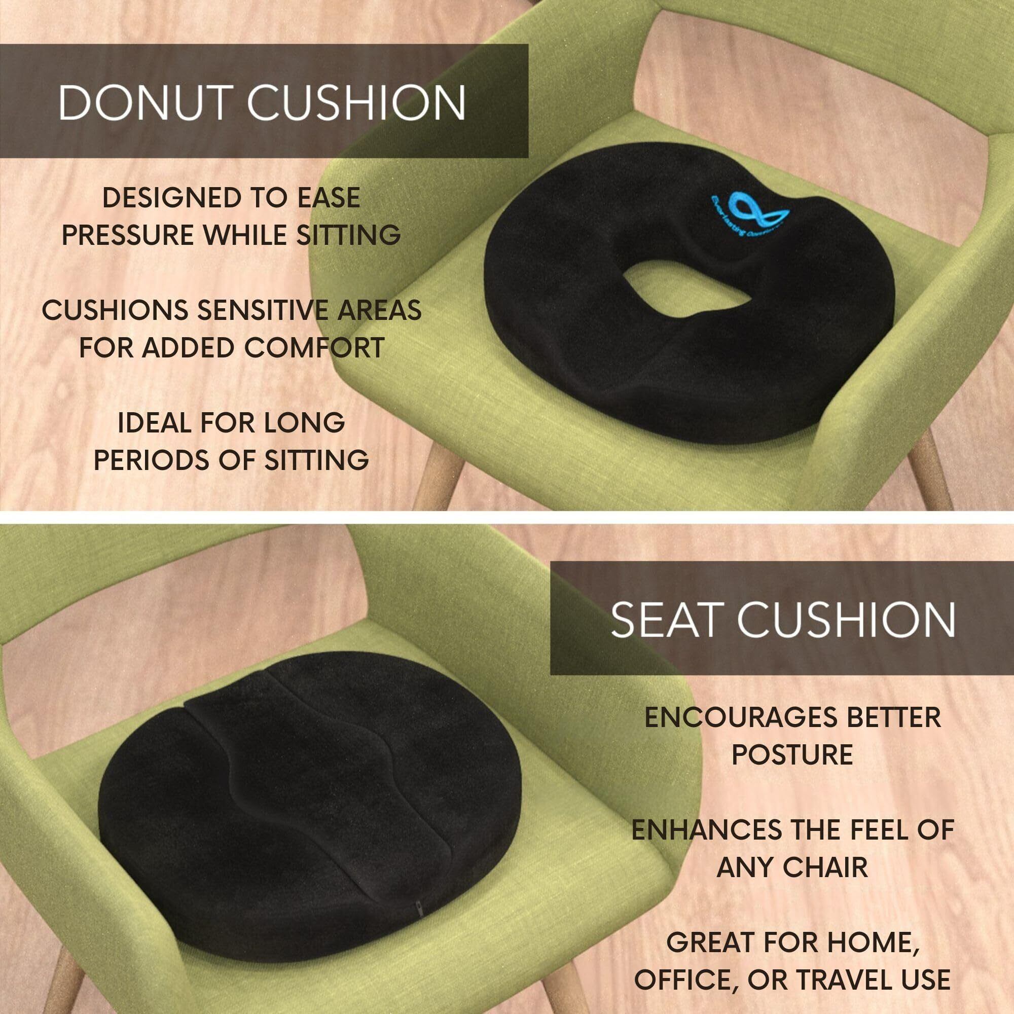 Everlasting Comfort 丸型シートクッション - 人間工学に基づいたドーナツクッション 2 in 1 丸型シートクッション、快適な座り心地のメモリーフォーム付き