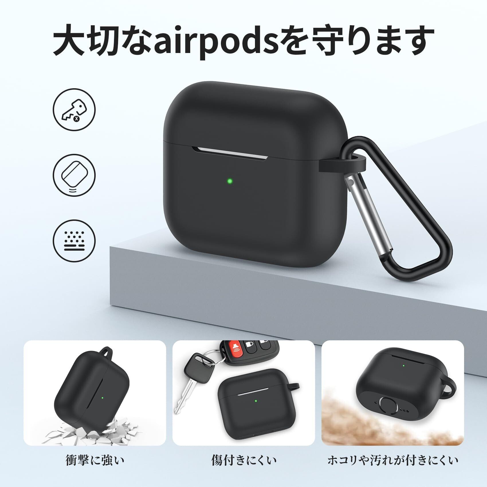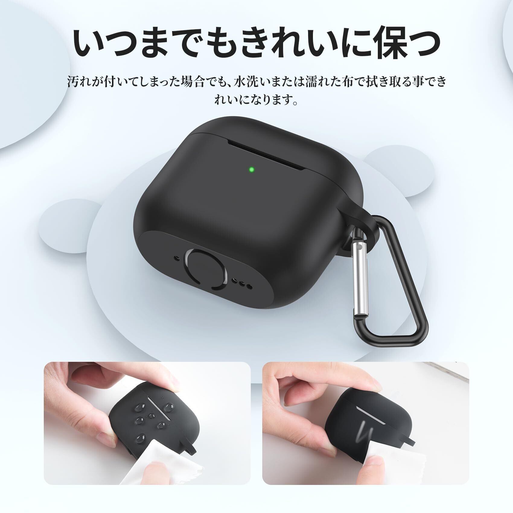 【しっかり保護】衝撃を吸収できる高品質シリコン素材を採用することで、触り心地が良いだけでなく、優れた保護力を発揮します。お使いのAirPodsを落下による衝撃や擦り傷からしっかり保護します。また柔軟性も高く、汚れや指紋がつきにくいです。少し汚れがついてしまった場合でも、水洗いまたは濡れた布で拭き取ることできれいになります。