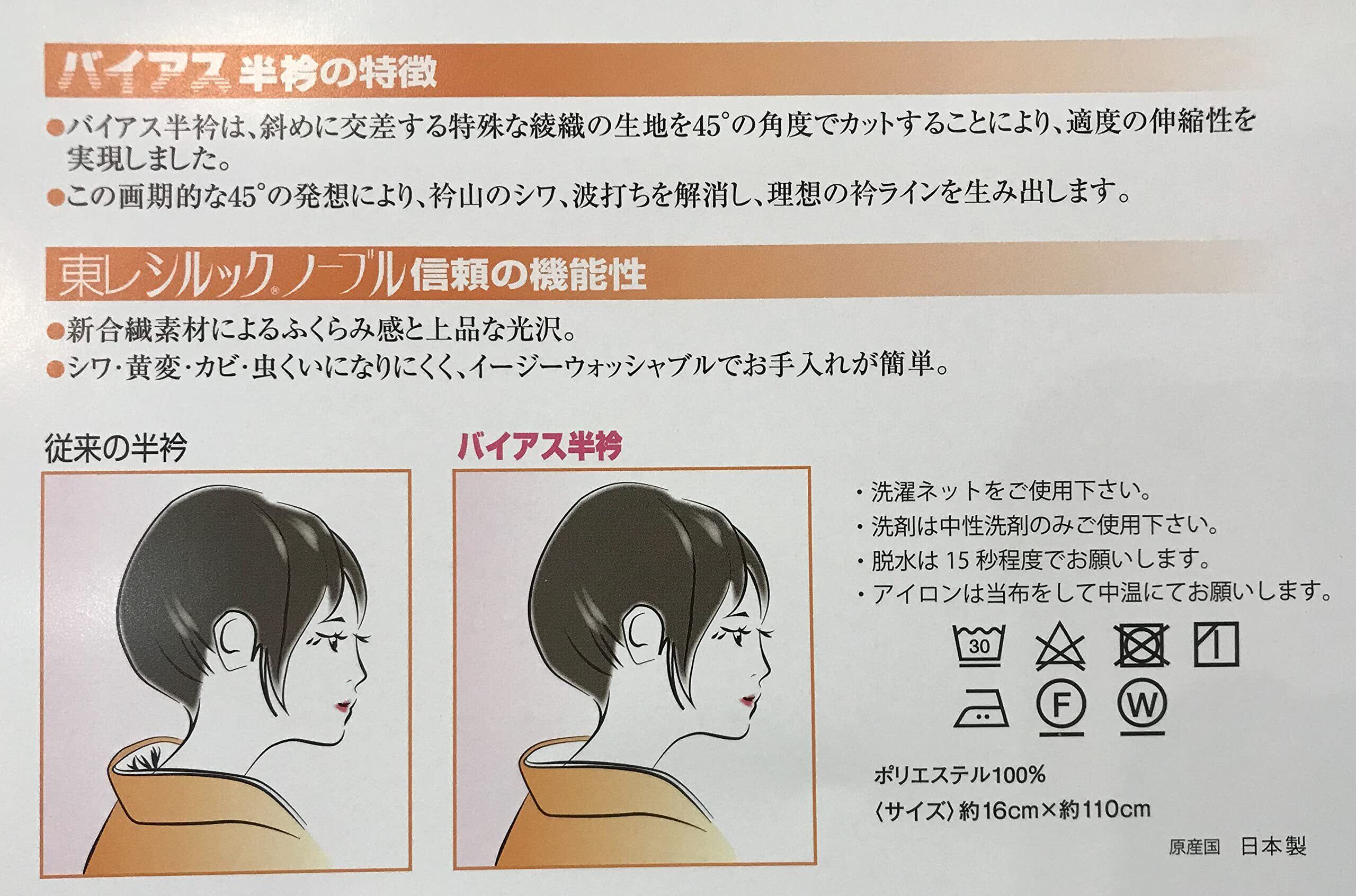 メイン素材: ポリエステル バイアス半衿は、斜めに交差する綾織生地を45°にカットすることにより、適度の伸縮性を実現しました。 45°でカットしてあるので、衿山のシワ、波打ちを解消します。 【素材】東レ シルックノーブル 新合繊素材によるふくらみ感と光沢があります。 シワ・黄変・カビ・虫食いになりにくく、イージーウォッシャブルでお手入れ簡単。