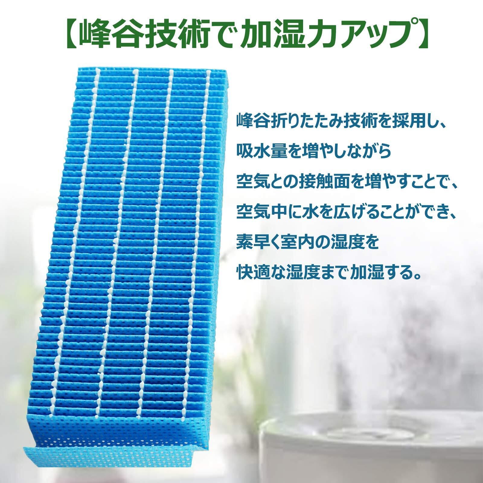【加湿機能】峰谷折りたたみ技術を採用し、吸水量を増やしながら空気との接触面を増やすことで、水分を含んだ抗菌・防カビ加工の加湿フィルターに風を当たて空気中に水を広げる気化式の加湿方で、素早くきれいに室内の湿度を快適な湿度まで加湿する。