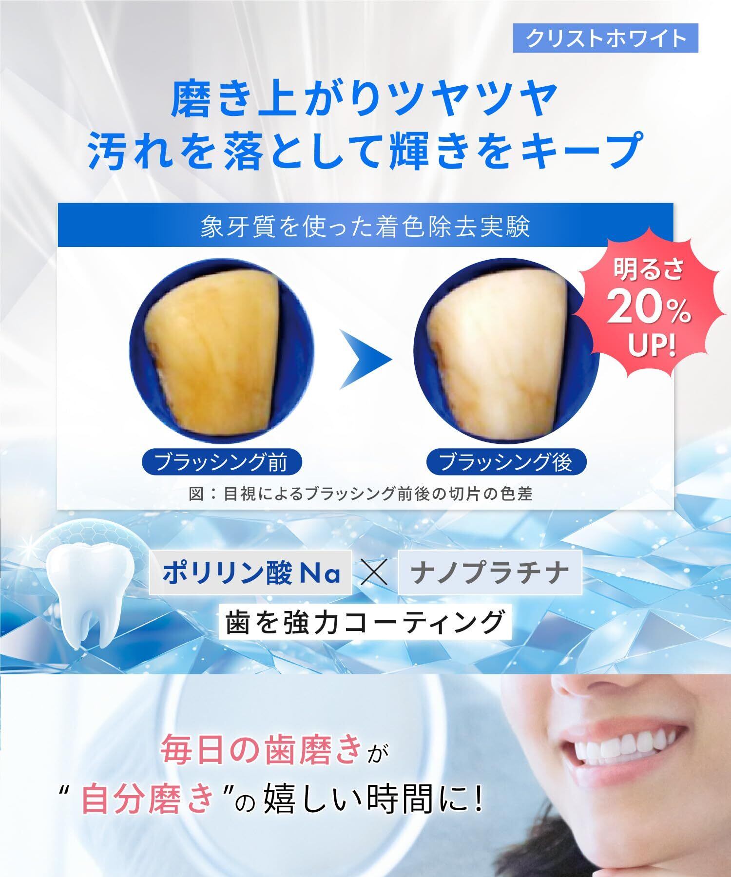 【輝く白い歯に】ナノプラチナ*とポリリン酸ナトリウム*を配合したホワイトニング歯磨き粉。ブラッシングにより歯垢や着色を除去し、輝く白い歯に導きます。