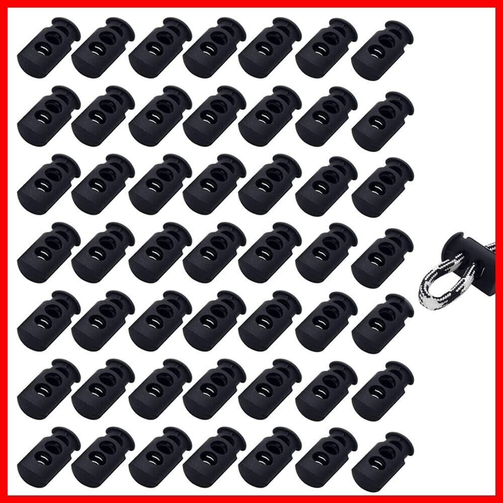 サムコス スプリング コードストッパー 50個入り 2つ穴 穴径約6mm 紐止め 交換 補修用 衣類 リュックサック 運動服など ロープ ストッパー (ブラック 樽型)