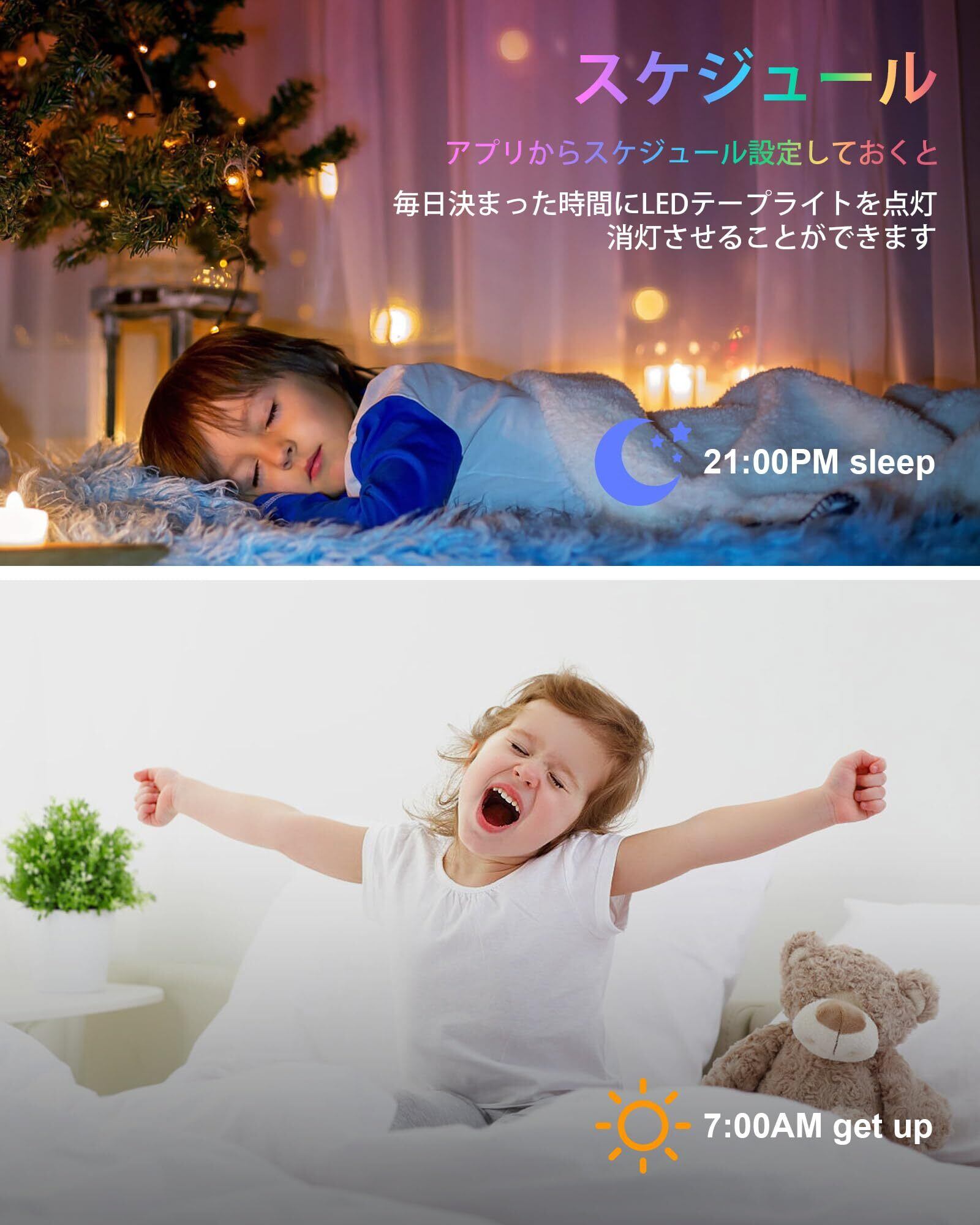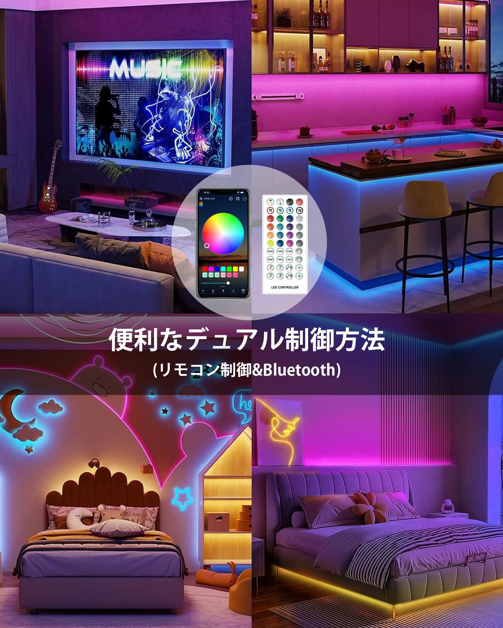 【デュアルコントロール、タイマー機能】アプリと40キーリモコンでテープライトのコントロールが可能。 AndroidとiOSに対応したBluetoothでアプリと接続することで、ledテープライトをコントロールすることができます。 ライトのON/OFF、明るさ、発光色、タイマーは、アプリから簡単に設定できます。 ※本製品は防水仕様ではありません。