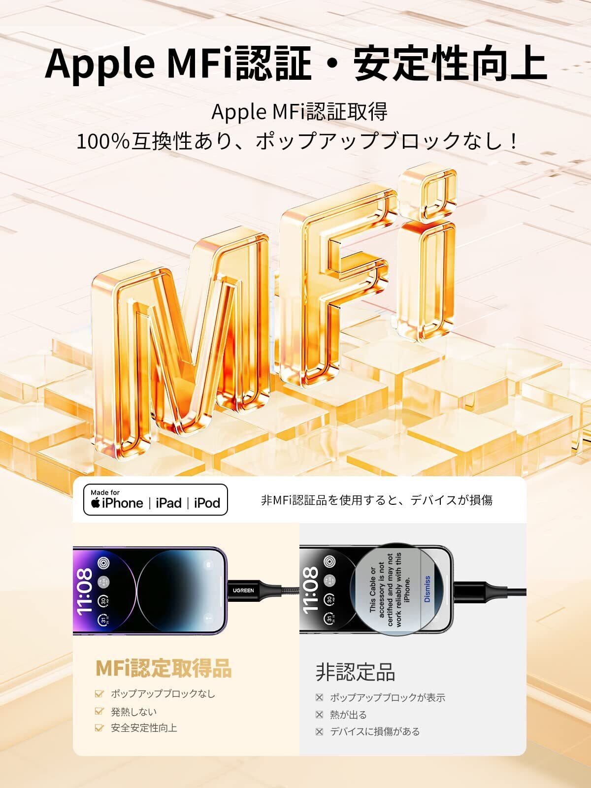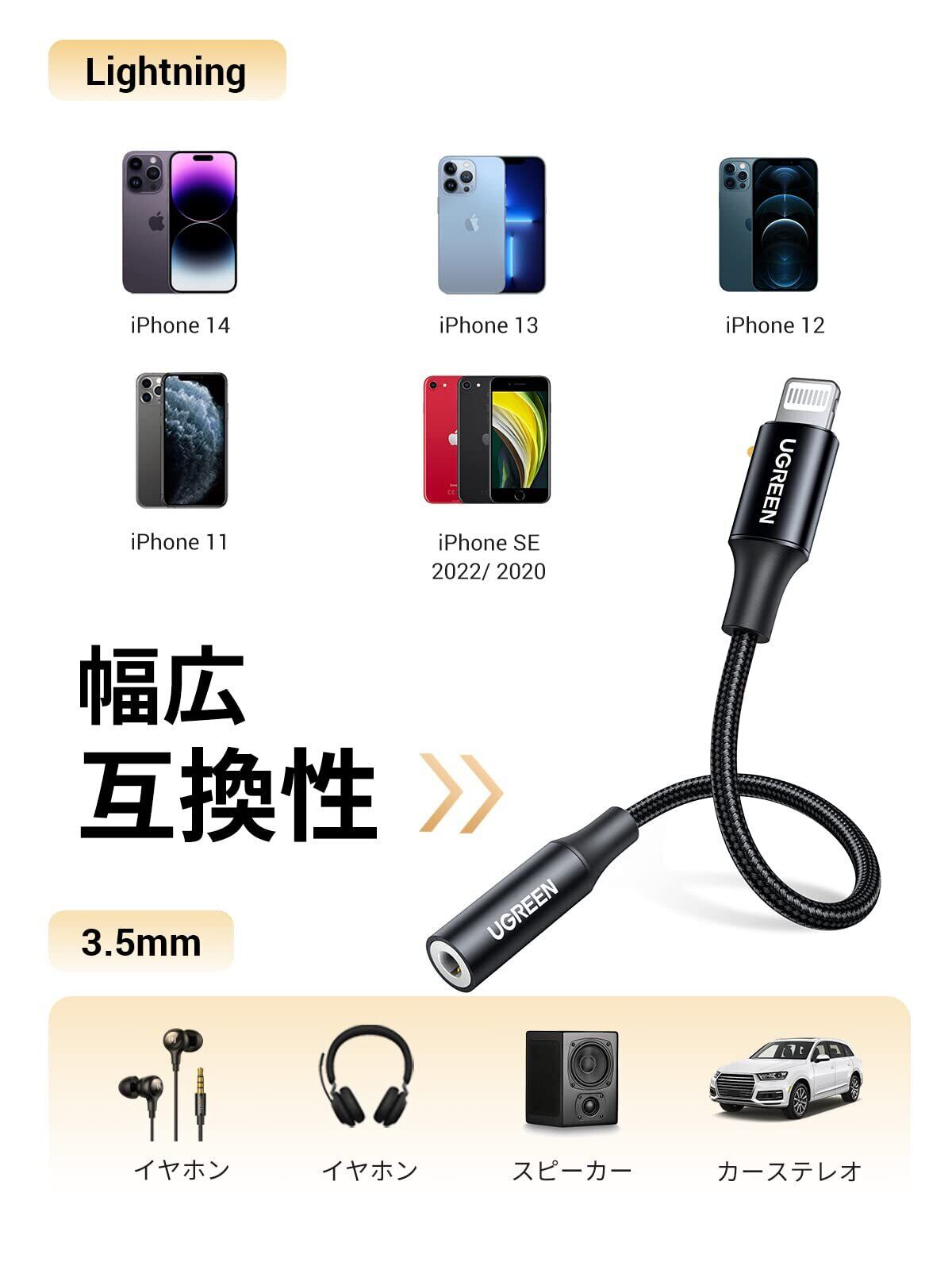【MFi認証取得・優れた互換性を確保】本製品ライトニング イヤホンジャックはMFi認証取得で、Apple純正のLightningコネクター(C101)を採用していることにより、iPhone/iPadへの損傷なく100%の互換性が実現。※iPhone 14シリーズを含む、iOS 10以降に対応するのも魅力!(UGREENのMFi認識取得型番:6957303837564)
