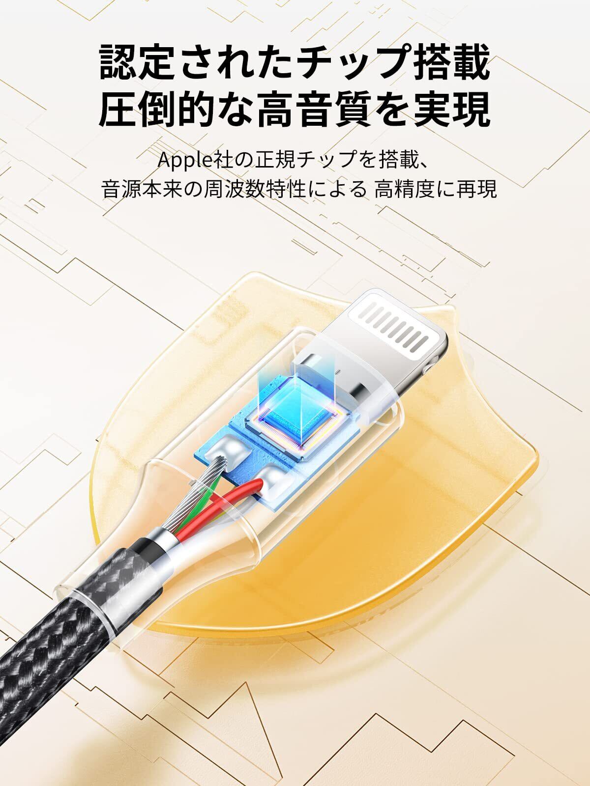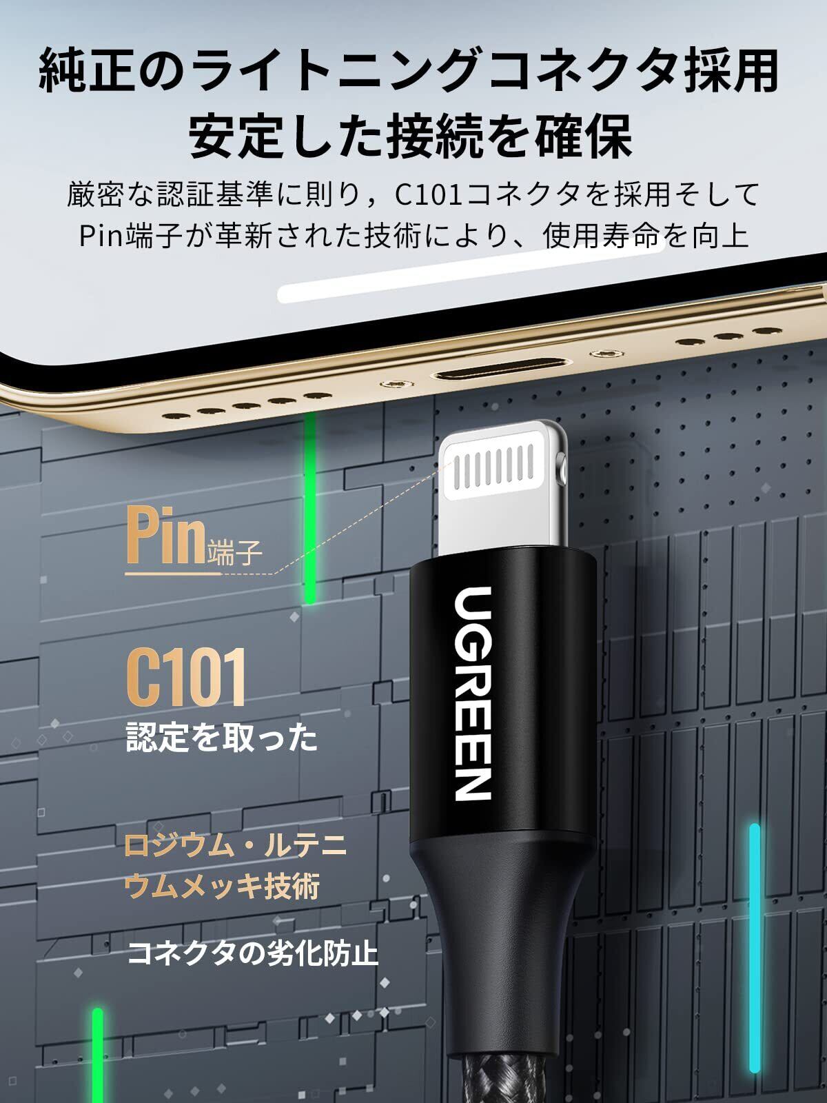 【高品質素材・安定性向上】Apple社が認証したコネクターを採用、Pin端子が革新されたロジウム・ルテニウムメッキ技術により、汗や油等の付着による端子部分の劣化など故障を防止して使用寿命を長続き!内部には粗い錫メッキ無酸素銅線コアを採用、効率的な伝送と安定した信号を確保して、より快適な体験を実現します。