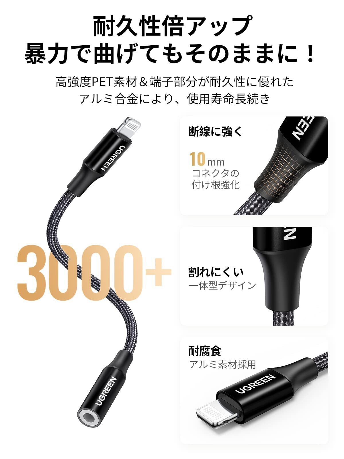 【高耐久性・保護力を倍UP!】アルミ合金と丈夫なナイロン編みを使用しており、30,000回のテストに合格し、頑丈で耐久性にも優れています。メッシュの末端には高強度TPE材を使用して一体化になり、コネクターの劣化を防ぎ、スリムな外観を維持したまま屈曲への耐久性を高めています。