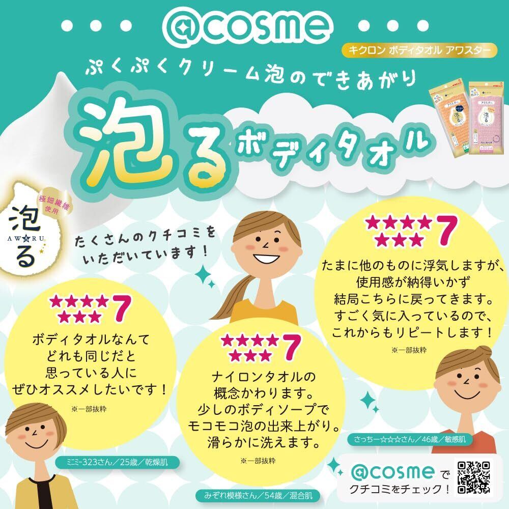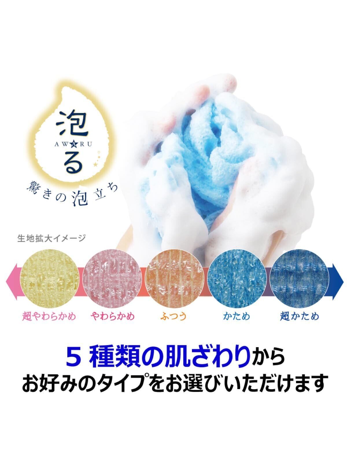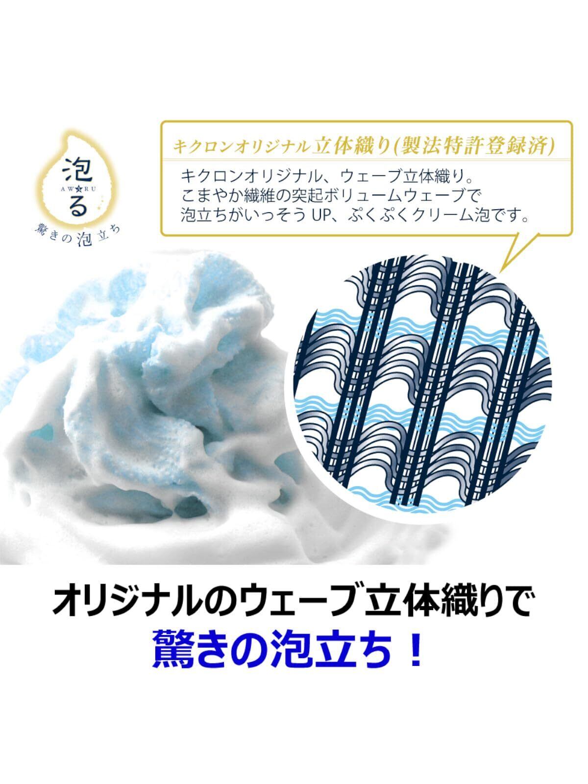 ●3次元ウェーブ立体織りキクロンの独自製法による立体織りで縦糸・横糸に作り出された3次元空間に、空気をたくさん溜めることで、圧倒的な泡立ちを実現しました。 ●超極細繊維66ナイロンアワスターの繊維には細さと強度が特長の、超極細繊維66ナイロンをたっぷり使用。独自の織りによるクリンプ加工が、コシとやわらかさを更にアップ、細くしなやかな繊維がお肌になじみ、きめ細かい泡立ちを生み出します。