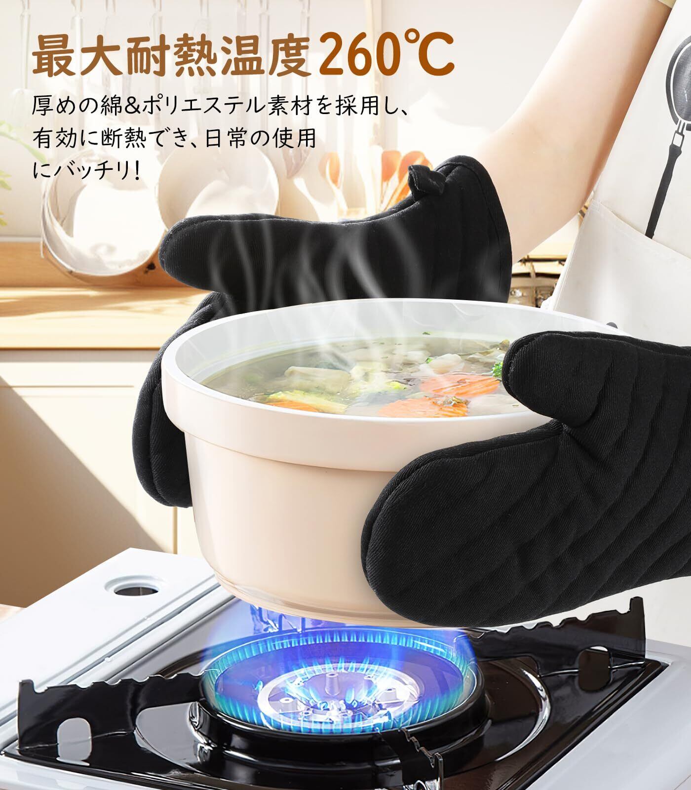 【耐熱】耐熱温度260℃のプロ仕様に作られている綿製手袋で、生地が厚く、丈が長いので、熱いものを持つ時も手や腕を熱から守ってくれます。