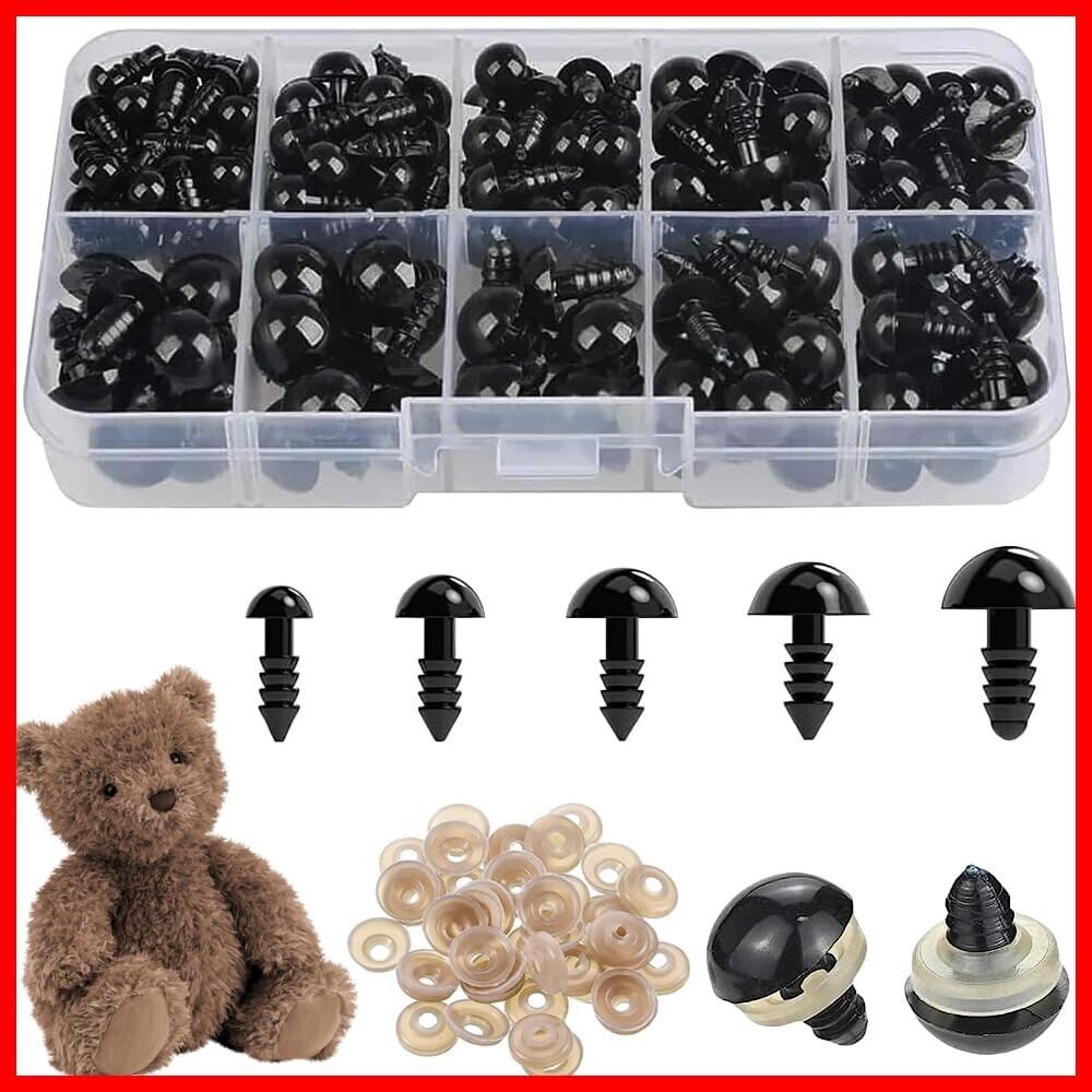 ぬいぐるみ目 人形の目 丸型 目玉 約100個入りドールアイ ぬいぐるみ 黒目 動物 人形 おもちゃ 手芸パーツ 手作り DIY 縫製 パーツ 材料 5サイズ(6mm/8mm/9mm/10mm/12mm)ワッシャー付き ブラック
