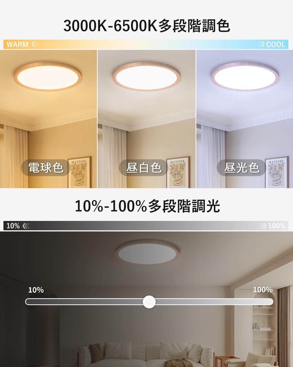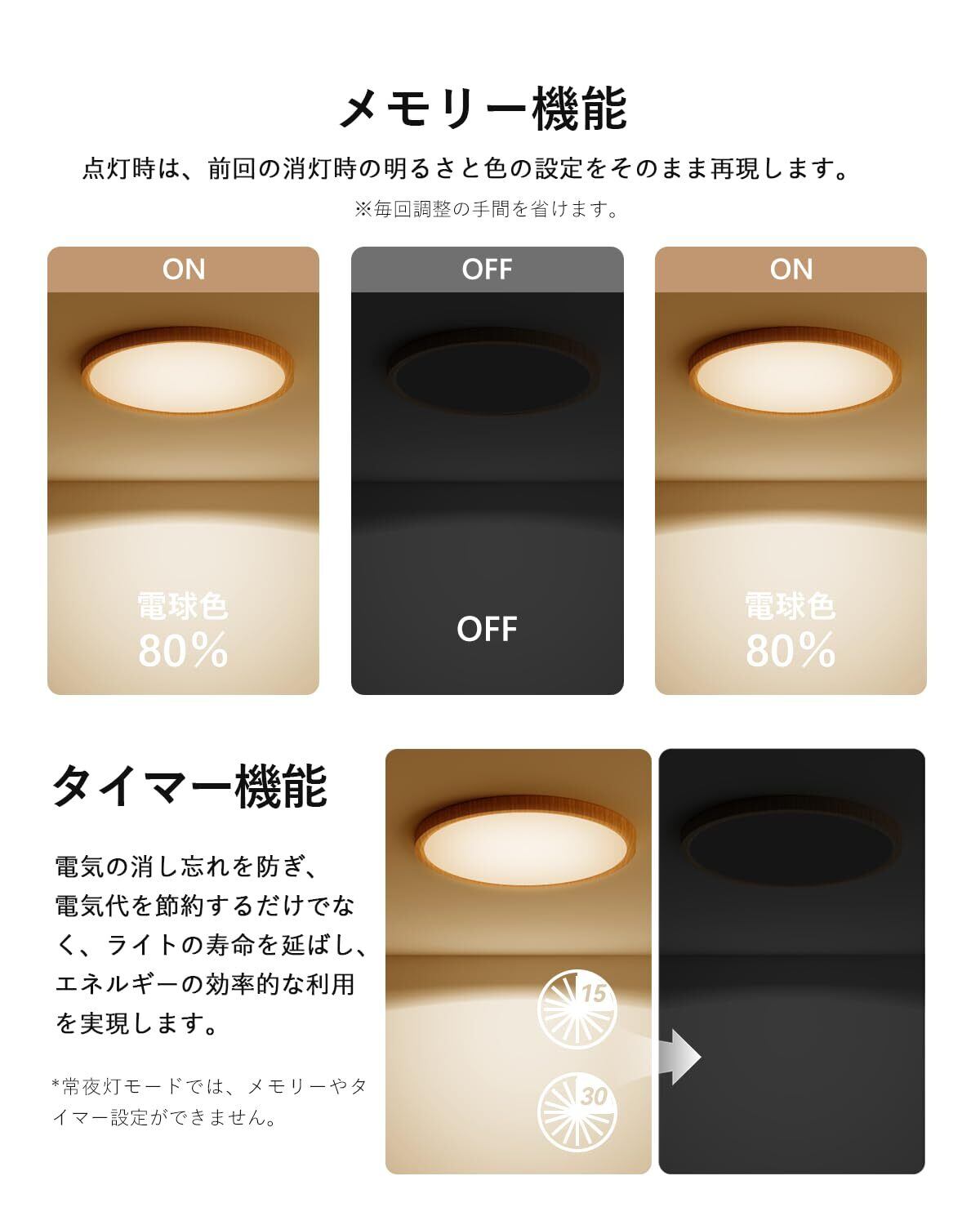 【多段階調光調色&5種類の色温度ワンタッチ変換】 電球色/昼白色/昼光色/常夜灯/常夜灯+昼白色+昼光色など、自由に変換できます。現在、新しくアップグレードされ、常夜灯と昼白色が同時に点灯するようになり、光がより明るく透き通るようになりました。リビングルーム/キッチン/寝室/書斎など、さまざまなシーンに適しています。