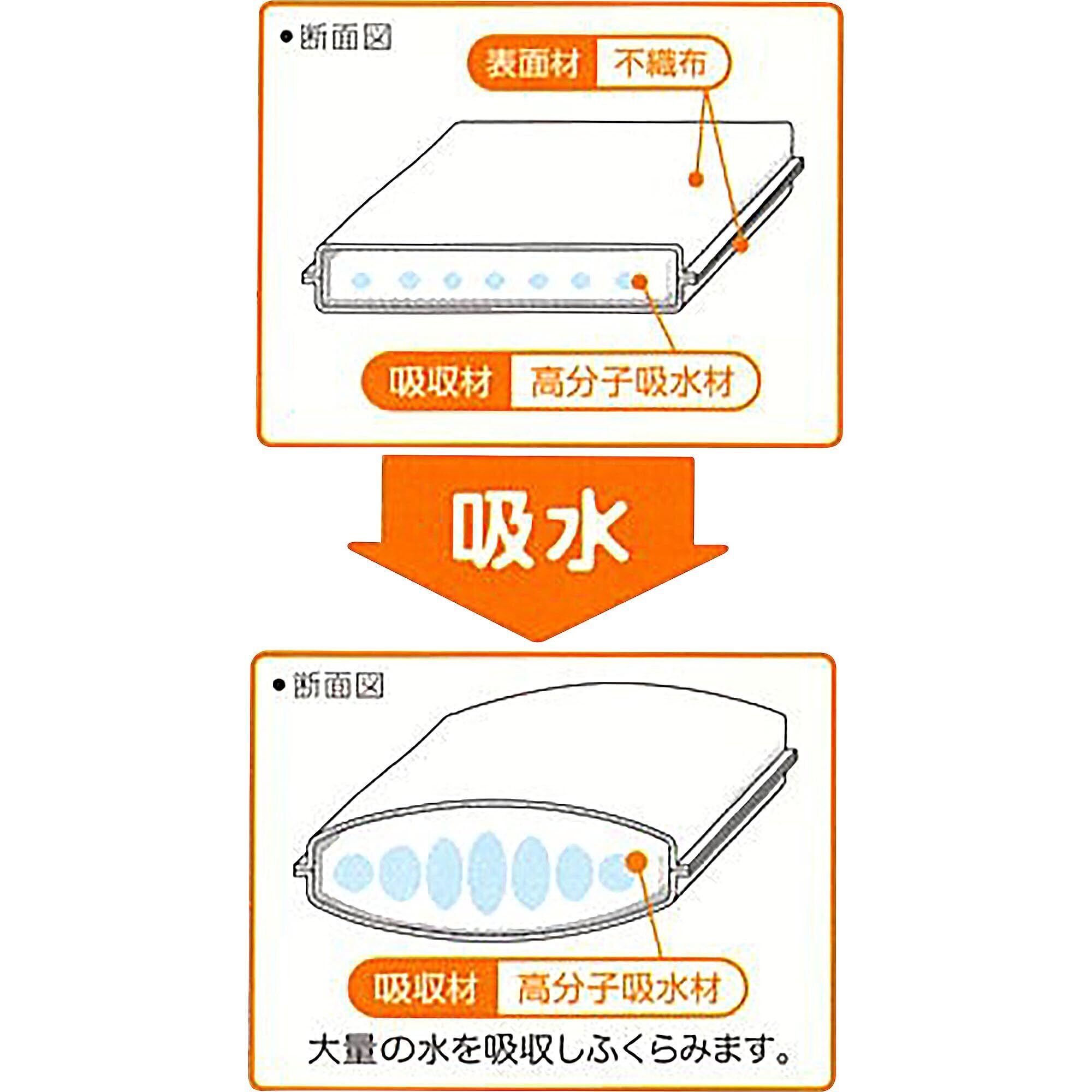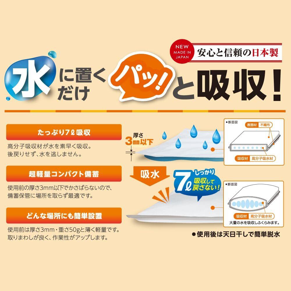 大雨やトイレの水漏れなど急な水漏れ対策に備えて安心の吸水シートです。災害時など生活防災用途としてご利用頂けます。防災グッズとして常備しておくと安心です。 水漏れ部部に置くだけでどなたでも簡単設置できる、吸水シートです。 たっぷり7リットル吸収。高分子吸収材が水を素早く吸収。後戻りせず、水を逃しません。 超軽量コンパクトでどんな場所にも簡単設置。使用前の厚さ3mm以下で重さ50gと薄く軽量でかさばらないので、備蓄保管に場所を取りません。 止水材としての使用、「油、溶剤、海水等」の吸収は出来ません。本来の用途以外では使用しないでください。吸水後の再利用は出来ません。使用後は3日程度の天日干し、もしくは脱水剤を使用して排水後、地域の規則に従って廃棄してください。切らずに使用してください。【商品サイズ】360mm×550mm 厚み3㎜(1枚あたり) 【袋サイズ/重量】222mm×20mm×470mm 約310g