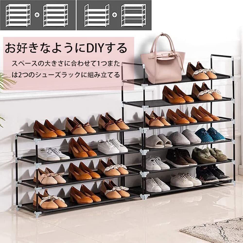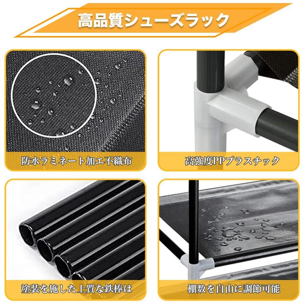 【高品質シューズラック】 1.太い鉄パイプ- 直径13mmの鉄パイプはプラスチックをコーティングした、防錆、優れた耐荷重、長く使っても変形しにくい。2.防水層付き不織布- 丈夫な高級コーティング不織布の表面に防水コーティングを施しているので、水滴と埃を布巾で拭き取れやすい。3.耐摩耗ジョイント- 高強度環境配慮型PPプラスチック材料で作られ、パイプをしっかり支えます。