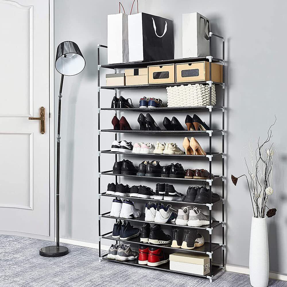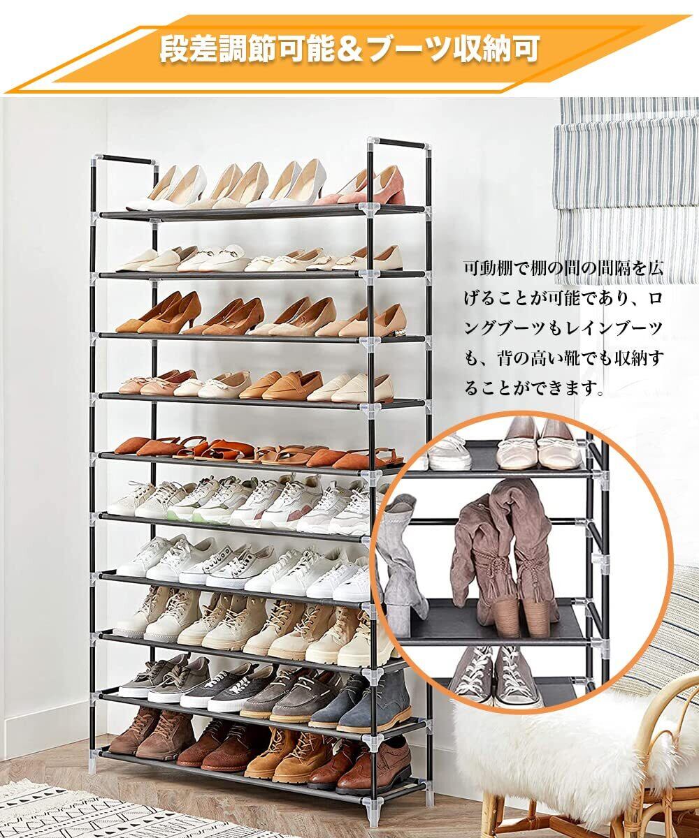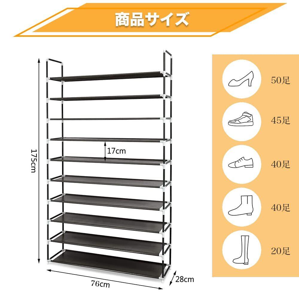 【大容量シューズラック】】この靴ラックは、全10段で、靴を38〜40足収納できます。収納スペースが狭く、靴が多い方に、この靴ラックは非常に好適です。「サイズ:76㎝*28㎝*175㎝」Diy自由自在に組み立て、棚板を1枚取り付けなければ、靴を入れることができます。シューズラックの高さを自由に調整できるので、靴の数によって5層、6層、8層、9層、10層までお好みによって自由に組み合わせることができます。お好みに応じて自由に組み立てられます。