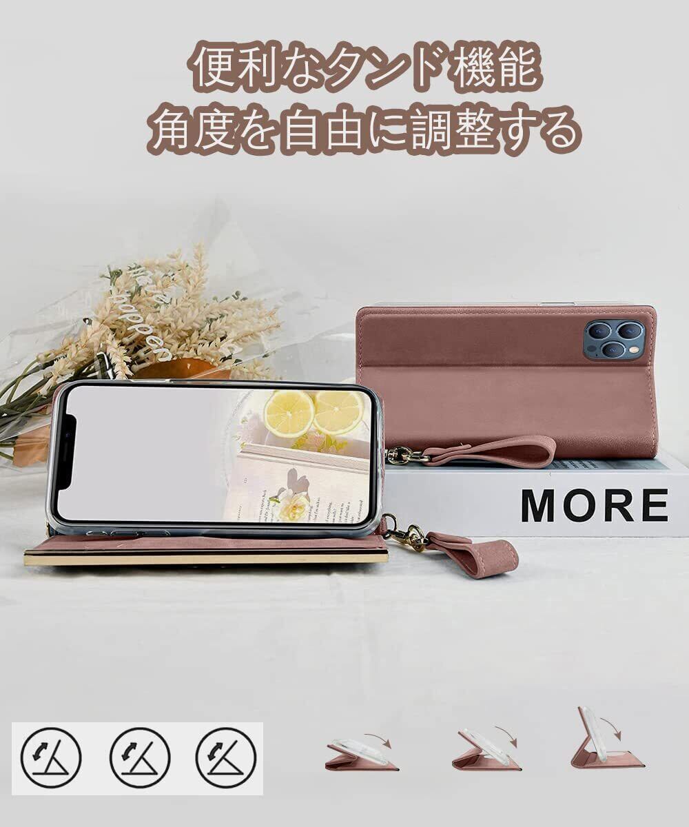 OCTERR iPhone 13 ケース 手帳型 鏡付き マグネット式 スマホケース 財布型 アイフォン13カバー カードポケット スタンド機能 携帯ケース ダイアリーケース PUレザー 女性 耐衝撃 全面保護 ファッション おしゃれ 美しい アプリコットピンク | hananoki