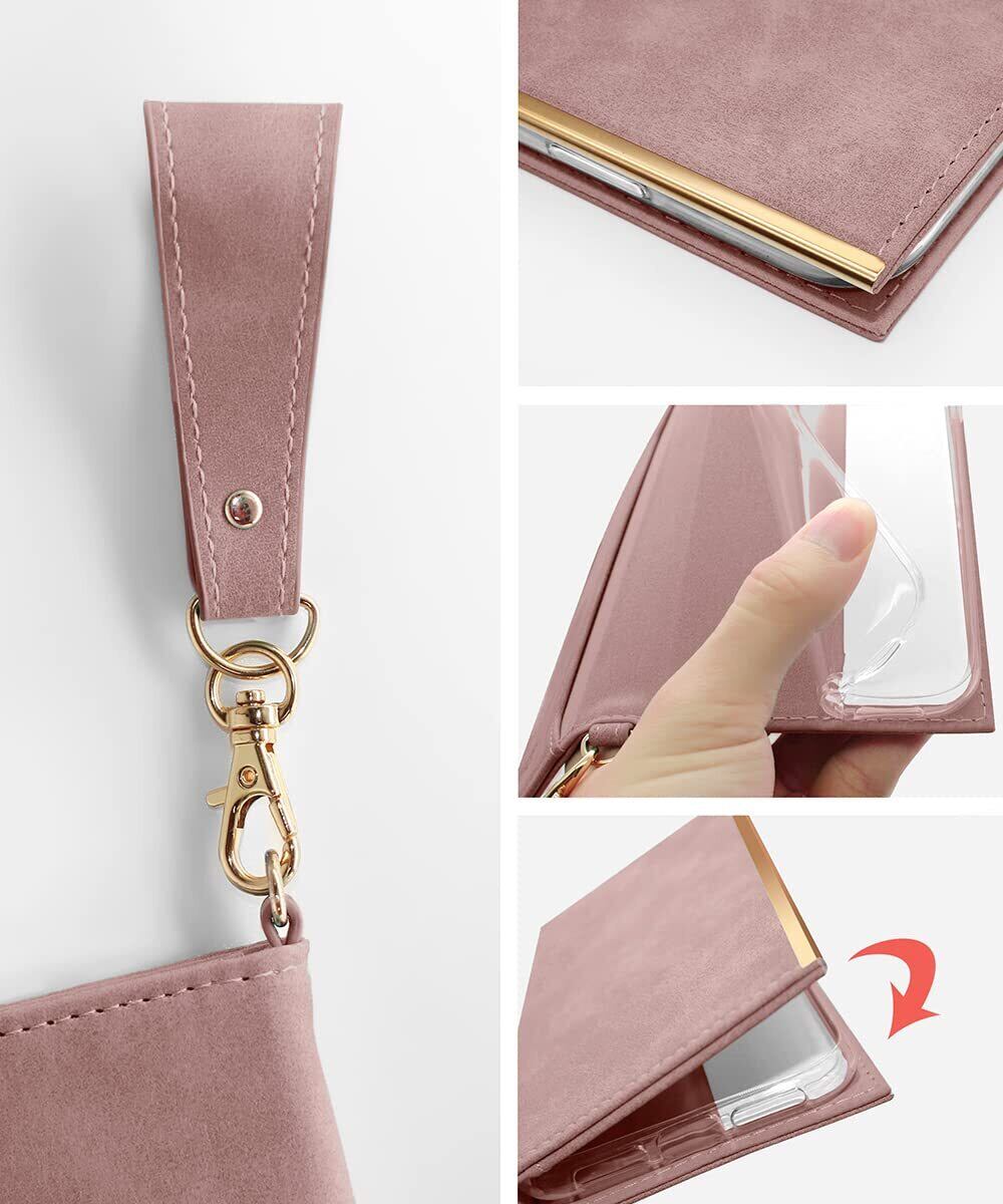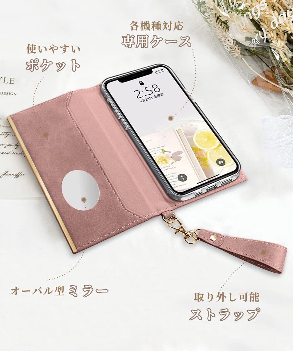 「便利なデザイン」 ①ミラー付き:背面の收纳部分には小さなミラーを配置。食事の後にリップを直したり、気になる前髪のチェックに使ったり...ちょっとした身だしなみの確認に便利なアイテムです。②マグネット付き:マグネット付いて、簡単に開け閉めができるから、片手で開きたい方にもとても便利です。 ③ストラップ付き:カバンの中入れておいてもすぐに携帯電話を見つけることができ、とてもり便利なデザインです 、もちろんケースから取り外すこともできて、お好みのストラップを入れることもできます。