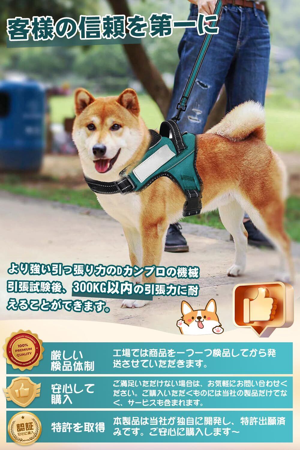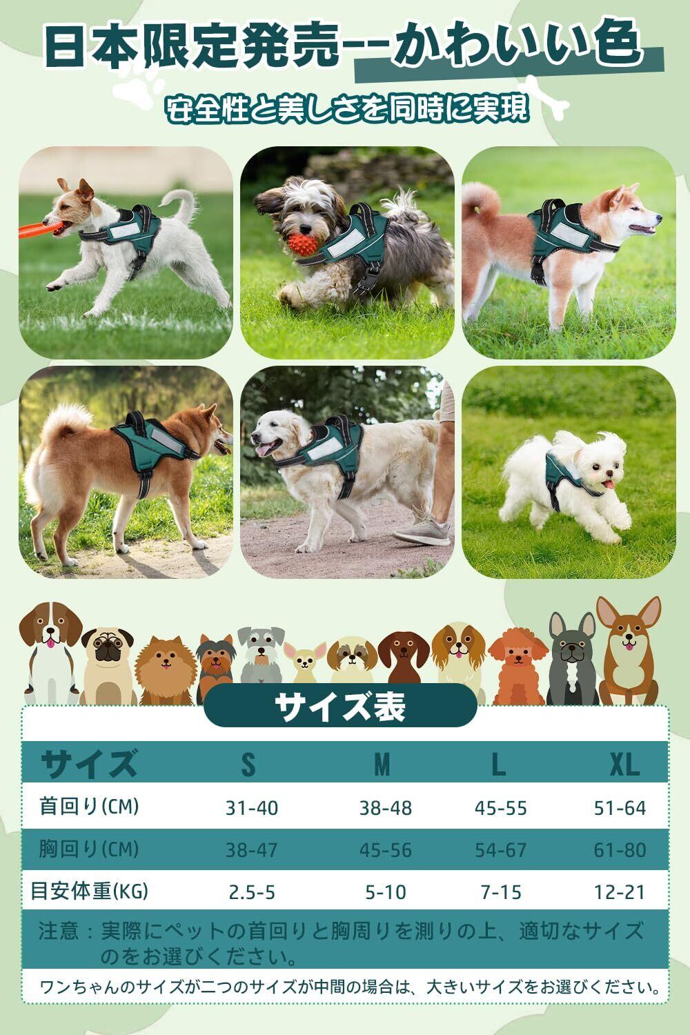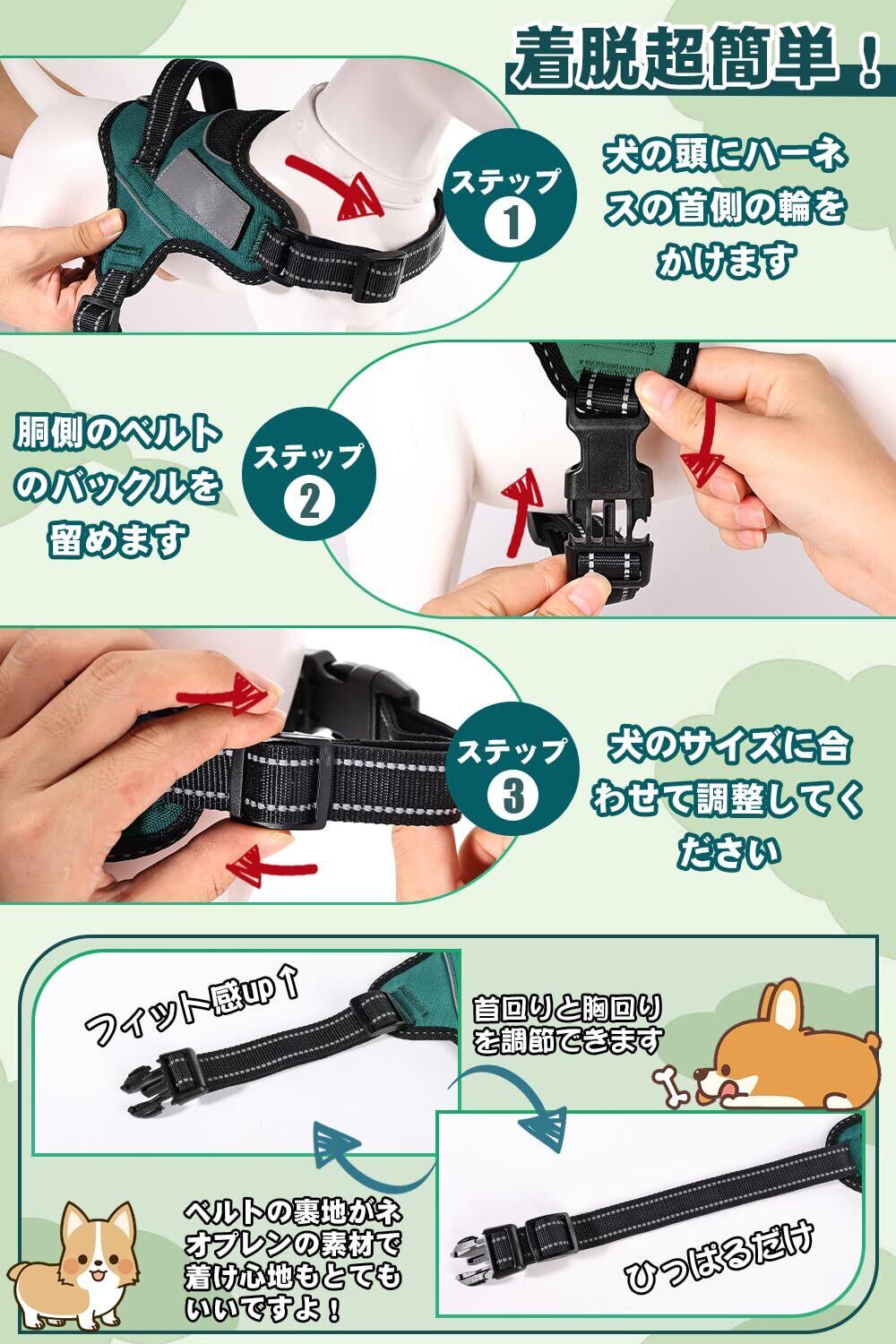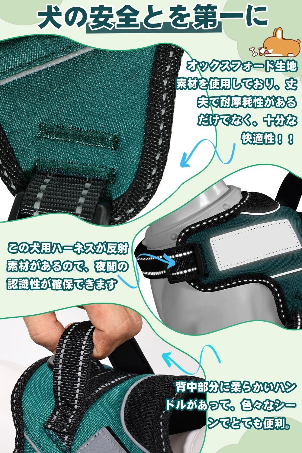 【ドッグトレーナー推薦】OGURIYA犬 ハーネス 喉に優しい 小型犬 中型犬 大型犬 着脱簡単 超可愛い色 ネームプレート 夜間反射 サイズ調整可能 犬体工学に基づいた 7色選択(ダークグリーン,S) | hananoki