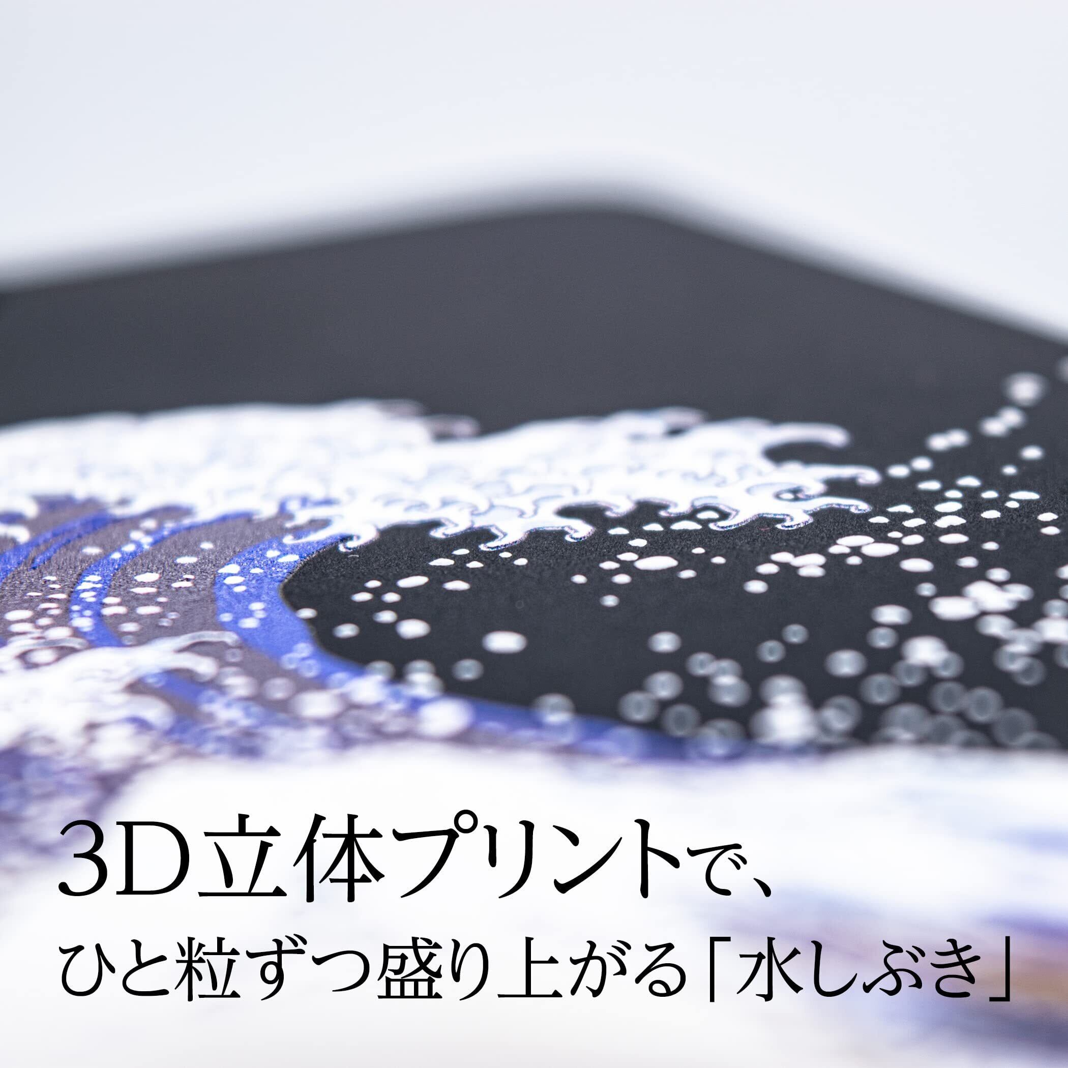 海の波のしずくのひとつひとつが「盛り上がるインク」で印刷され、立体的に表現されています。さらっとした触り心地の、つや消しのマットな黒いソフトケースに3D立体UVプリントで表現されています。