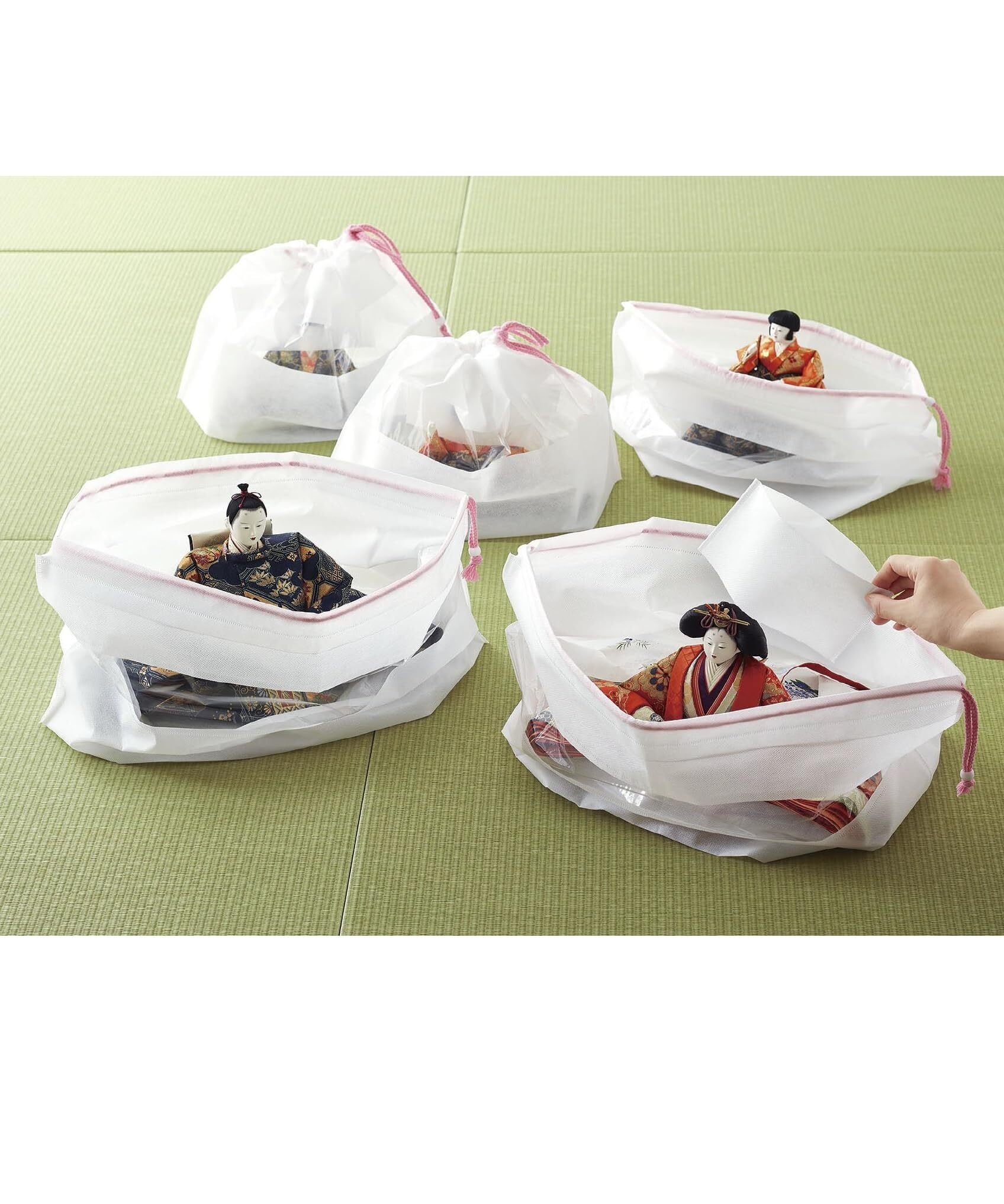 ひな人形を大切に収納。 不織布使用、出し入れ簡単な「巾着タイプ」の収納袋です。 中身が見える透明窓付。 大切なお顔を守る顔カバー付。 工場変更、粗利改善、顔カバーの仕様が従来と異なる。 【製品サイズ】平面/大:60×30 cm、小:50×30 cm、顔カバー:18×9 cm 展開時有効サイズ目安/大:30×30×マチ30 cm、小:25×30×マチ25 cm、顔カバー:9×9×マチ7 cm