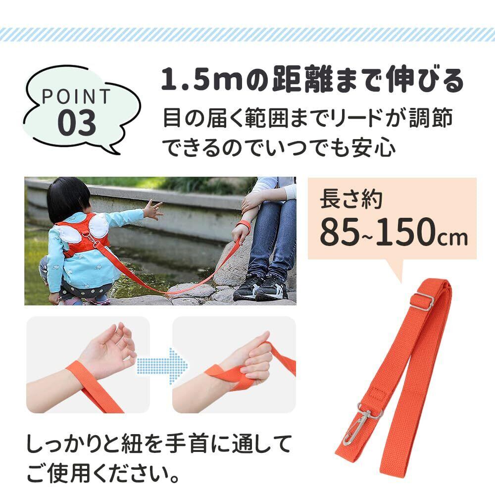 【1.5m伸縮リードで快適&コントロールしやすい】 お子様の自由な動きを尊重しながらも、適度な距離でしっかり見守れる伸縮リード付き。リードの長さは85cm~150cmまで調整可能で、狭い場所では短く、広い公園や遊び場では少し長めに設定することで、より快適にお使いいただけます。手首をしっかり通せるループストラップ付きで、持ちやすく親御さんの負担も軽減。しっかりとした固定力があり、子供が急に走り出しても対応しやすい仕様。