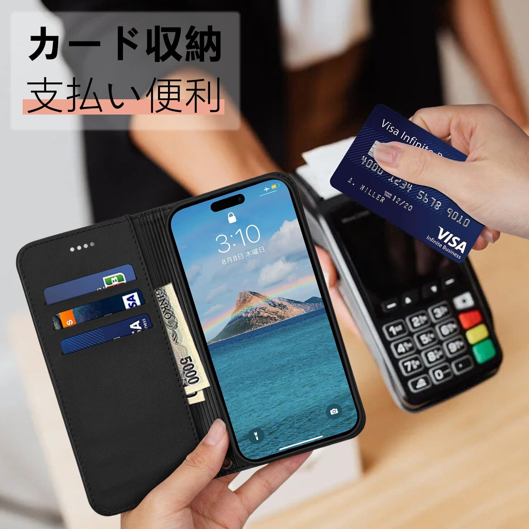カード収納:アイフォン 16 用 手帳型ケースの内側にはカード入れのポケットが付くため、重要な連絡先の名刺やクレジットカード十IDカードの収納に使用し、外出時はこのケースを携帯するだけで十分、日常の生活に便利です。なお、厚みのあるカード収納や、収納数により厚みがあるとフタが閉まらない事がございます。予めご了承下さい。