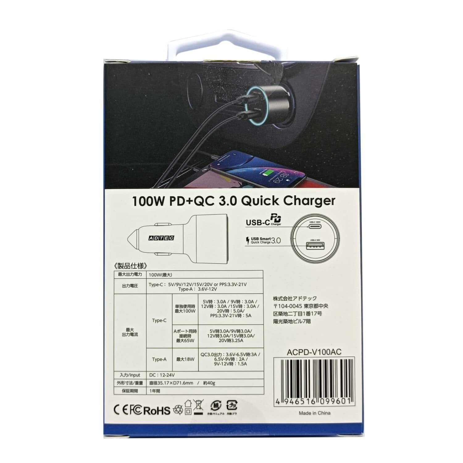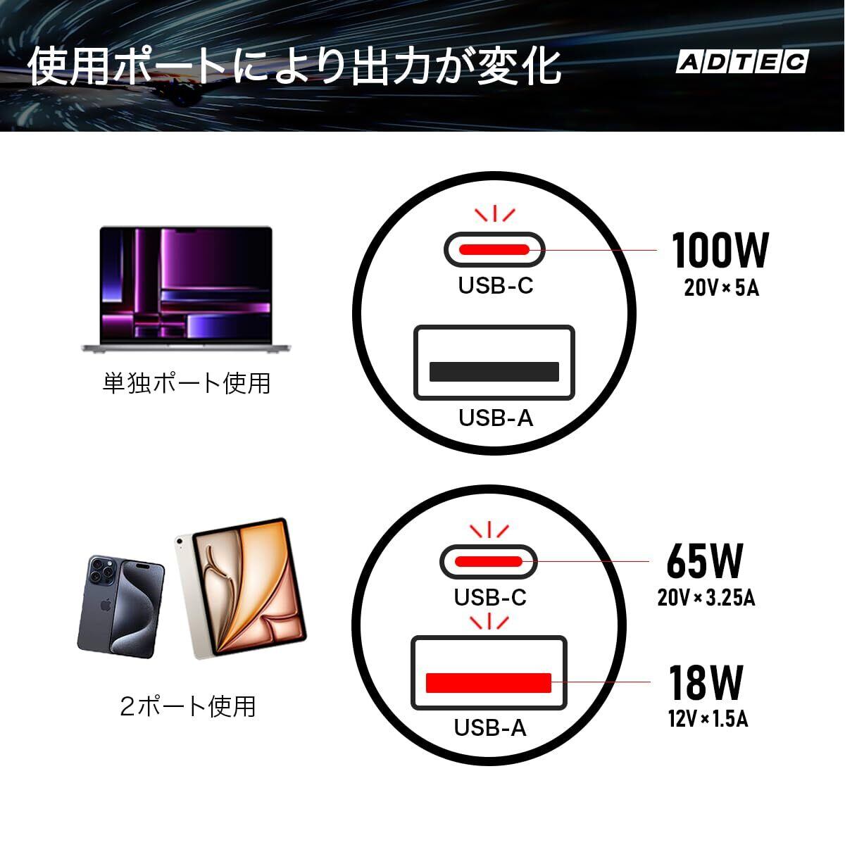 アドテック シガーソケット PD充電器 100W 2ポート 【USB-C+USB-A】カーチャージャー Macbook Pro DELL HP Dyanabook iPhone Pad Android Xperia Switch ACPD-V100AC