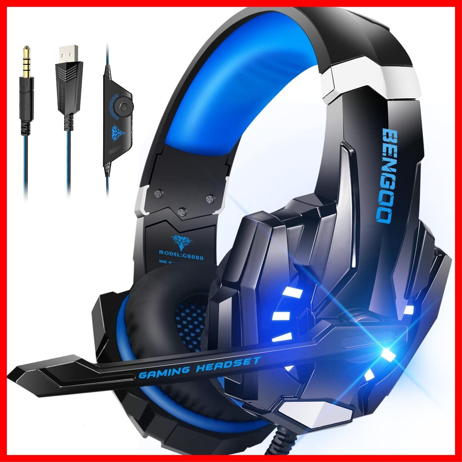 BENGOO ゲーミングヘッドセット PS5 ヘッドセット ノイズキャンセリング マイク付き 3.5mm有線 ゲーミングヘッドホン スイッチ ヘッドフォン 軽量 全効能 重低音 LEDライト コントローラー ミュート付き ステレオ FPS ゲーム用 Nintendo Switch Xbox One PS4 スマホ PC対応 (青)