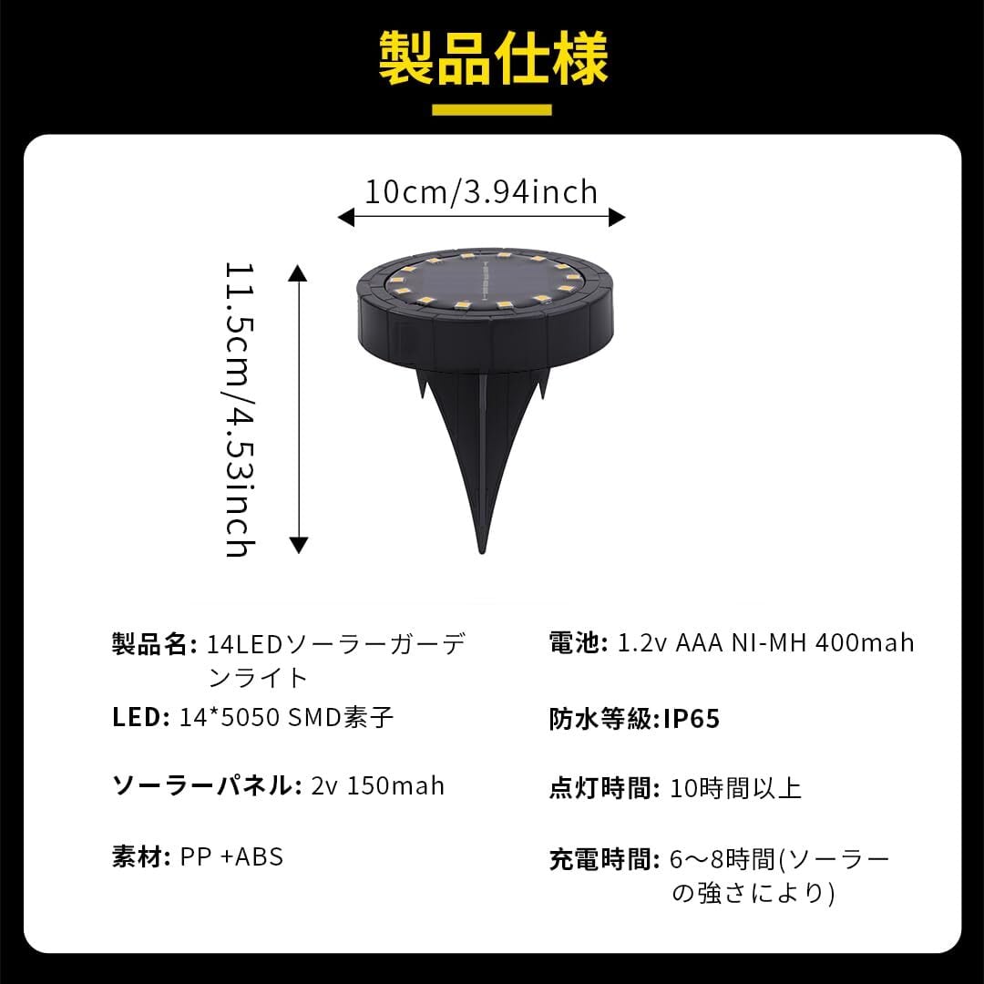 これらのソーラーガーデンライトは、デッキ、パティオ、歩道、プールの周りなどの屋外スペースを照らすのに最適です。14個LEDライトは長寿命で省エネルギーで、夜間の美しい雰囲気を演出します。IP65防水設計なので、雨や雪の中でも安心して使用できます。ペグで地面に差し込むだけの簡単設置で、ケーブルの配線は不要です。ソーラーパネルが日中太陽光を集め、夜になるとライトが自動的に点灯します。4個や8個セットで、庭やアプローチを効果的に照らすことができます。高さは約11.5cm(約4.53インチ)で、本体は風雨に強く、長年の使用に耐えられます。メンテナンスも簡単で、ほとんど手入れが不要です。お庭の雰囲気を一新したい方におすすめのソーラーライトです。
