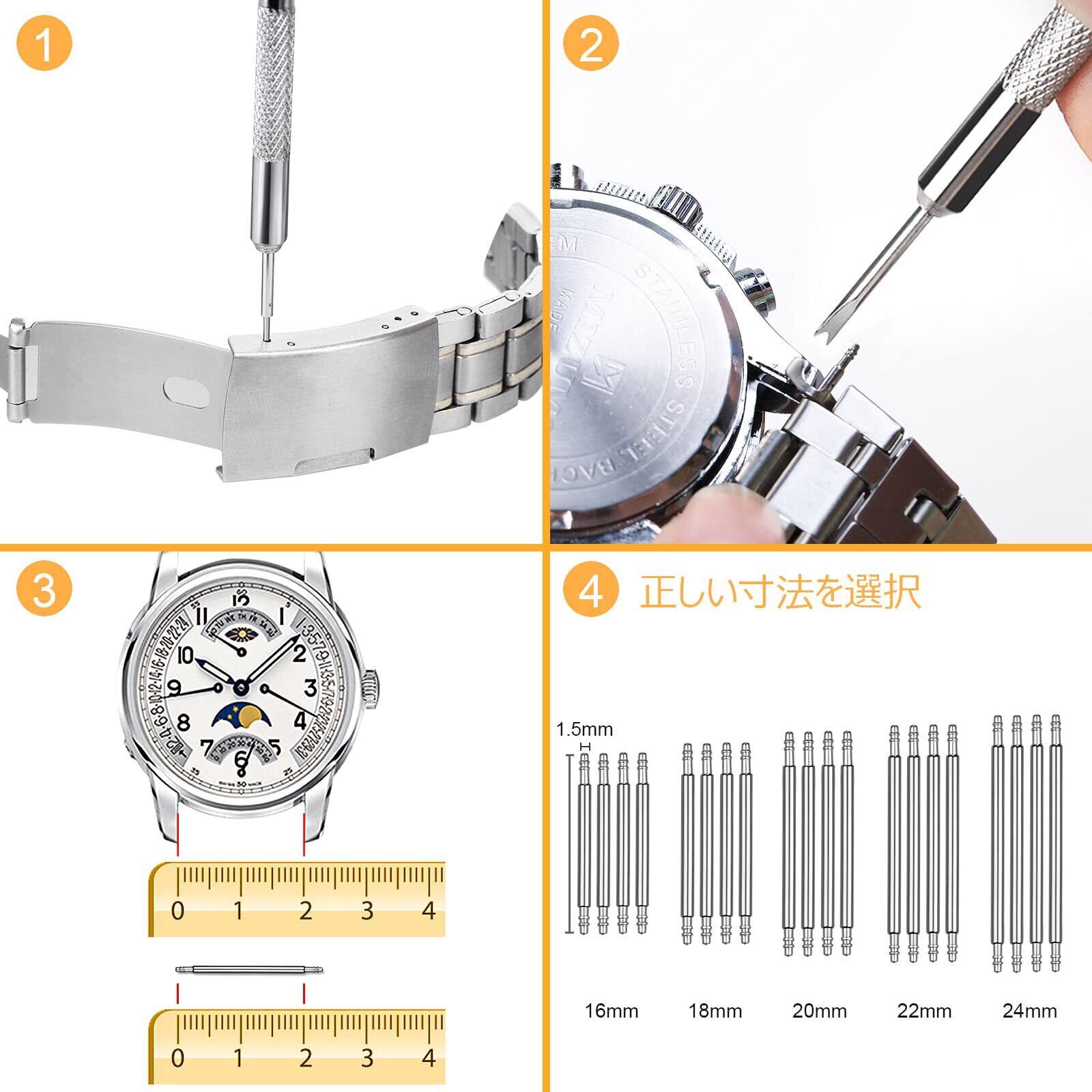 【時計ストラップ調整キット】-- キットには、金属製時計バンドリンクリムーバー、パンチ針、ストラップ交換工具、双頭ハンマー、時計バンドホルダー、13PCSスペアニードル、20PCSの1.5Φスプリングバー(4 * 16/18/20/22/24mm)と取扱説明書。