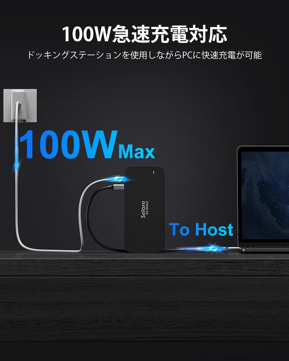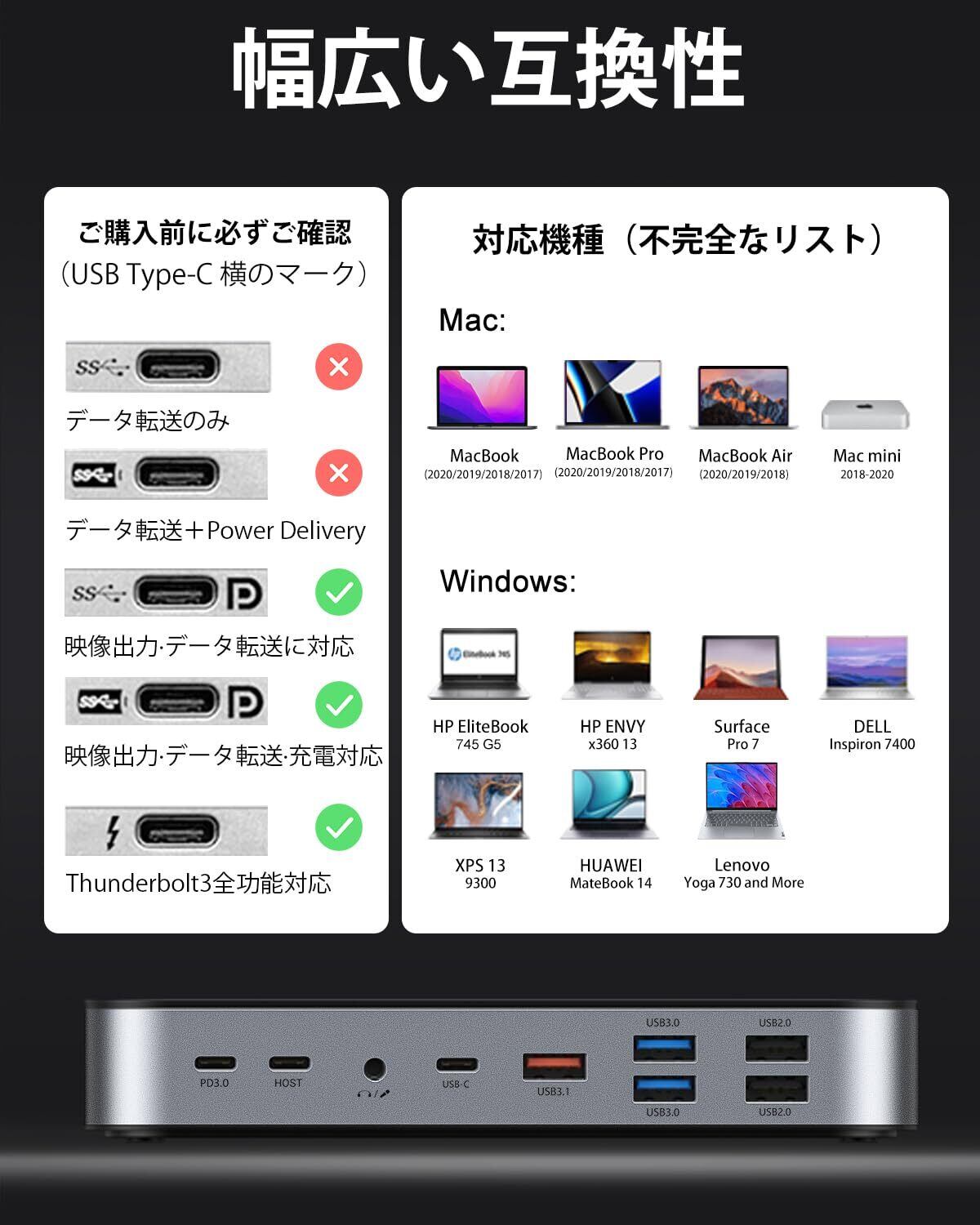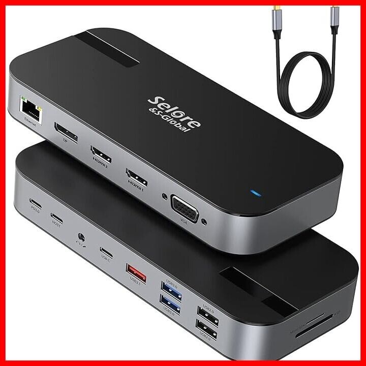 【16-in-1ドッキングステーション 4画面出力】Selore ドッキングステーションノート 付属のUSBケーブル1本で、パソコン・Windowsタブレットと様々な周辺機器を接続可能なUSBドッキングステーションです。ディスプレイ最大4台( 2つHDMI/DisplayPort/VGA)、各種USBデバイス、有線LAN、USBオーディオの拡張接続ができます。 USB-C/Thunderbolt 3端子一つを16つのポートに(2*4K HDMI出力端子、DisplayPort、VGA、USB C 3.1(10 Gbps)、USB A 3.1(10 bps)、2*USB A 3.0、2*USB 2.0ポート、2*Type-C、TFポート、SDポート、1Gbps イーサネット/RJ-45 ポート、3.5mm オーディオ ポートを備える)頻繁に持ち運びする小型ノートパソコンやタブレットなどをUSBケーブル1本の接続で様々な機器に接続・出力でき、快適な操作環境を実現します。