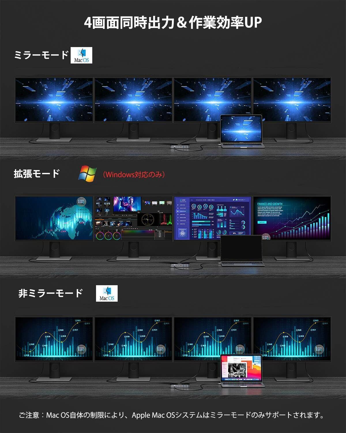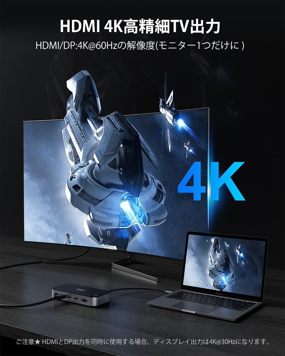 【MAX 4画面出力&最大解像度4K】USB C ドッキングステーションは2つのHDMIポート+1つのDPポート+1つのVGAポートを介して、お客様のパソコンを最大4台のモニターに拡張モードや複製モードで出力が可能。モニター1つだけに接続したときHDMI 1/DPが最大4K@60Hzの解像度をサポートし、HDMI 2は最大4K@30Hzの解像度に達します。デュアルディスプレイ(HDMI 1/2+DP)の場合、最大4K@30Hzおよび4K@60Hzの解像度がサポートされます。(※4K/60Hzを利用するには、PCがDPort 1.4 Alt Modeに対応必要)3つのディスプレイまたはVGAを使用した4つのモニターの場合、ディスプレイ出力は1080Pになります。)