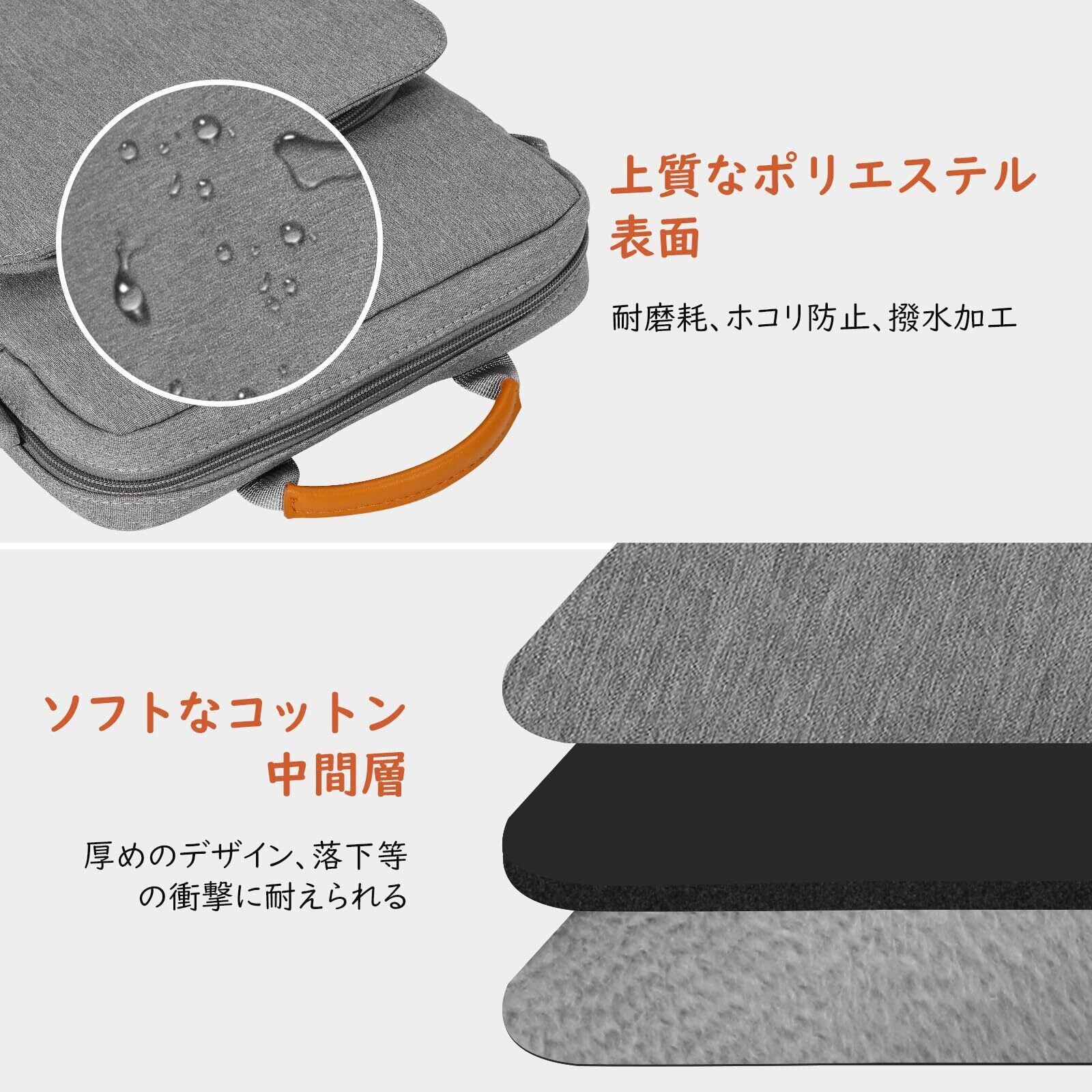 「上質な素材採用」 内側は柔らかいミナマット生地を使っており、衝撃やスクラッチから大切なタブレットをしっかりと守ってくれます。外側はポリエステル素材を採用し、撥水加工を加え、耐久性に優れ、汚れや衝撃を防止でき、完全な保護を提供しております。
