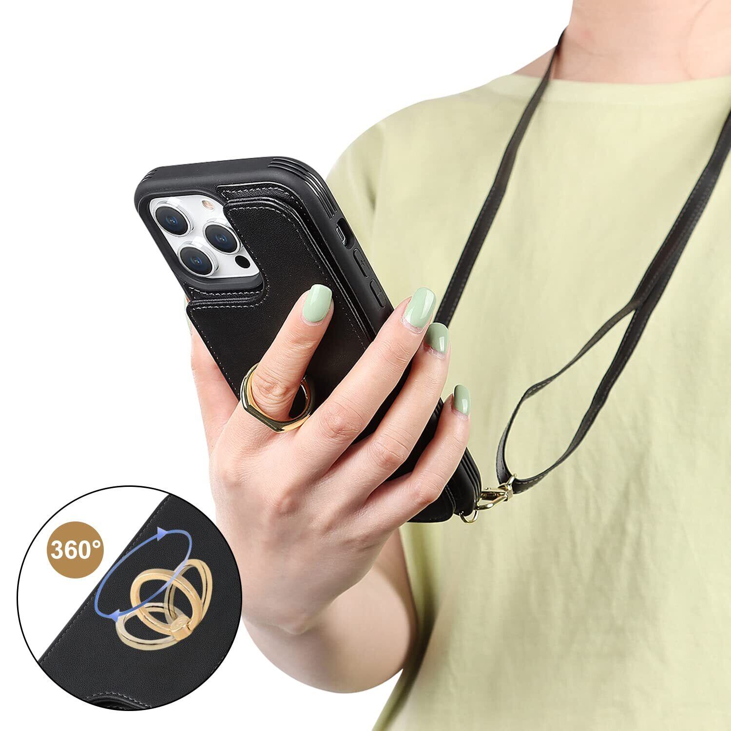 Cavor iPhone13 iPhone14 手帳型ケースiPhone14 スマホケースショルダー クロスボディ肩掛け 首かけ 斜めがけショルダー ケース 背面ポケット付きiPhone13 財布型ケース【上下開】iPhone13 携帯ケース【RFID機能】iPhone14 case カード収納 360°回転リング 横置磁気機能 Qi急速充電対応 -ブラック