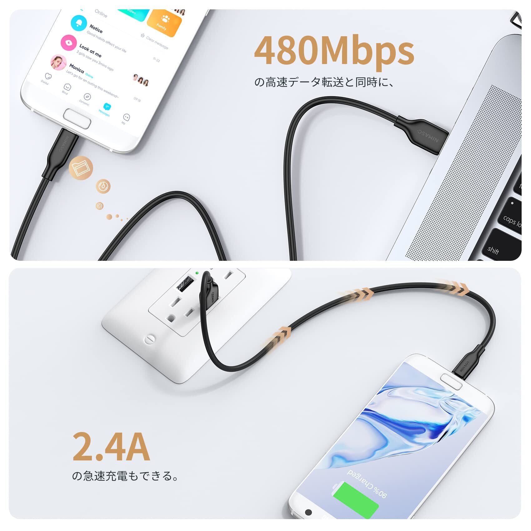 【急速充電と高速データ転送】最大2.4A大電流で、あなたのデバイスを素早く充電できます。USB 2.0基準で最大480Mbpsの速度でデータを転送できます。デバイス充電もデータ転送も、この一本で。