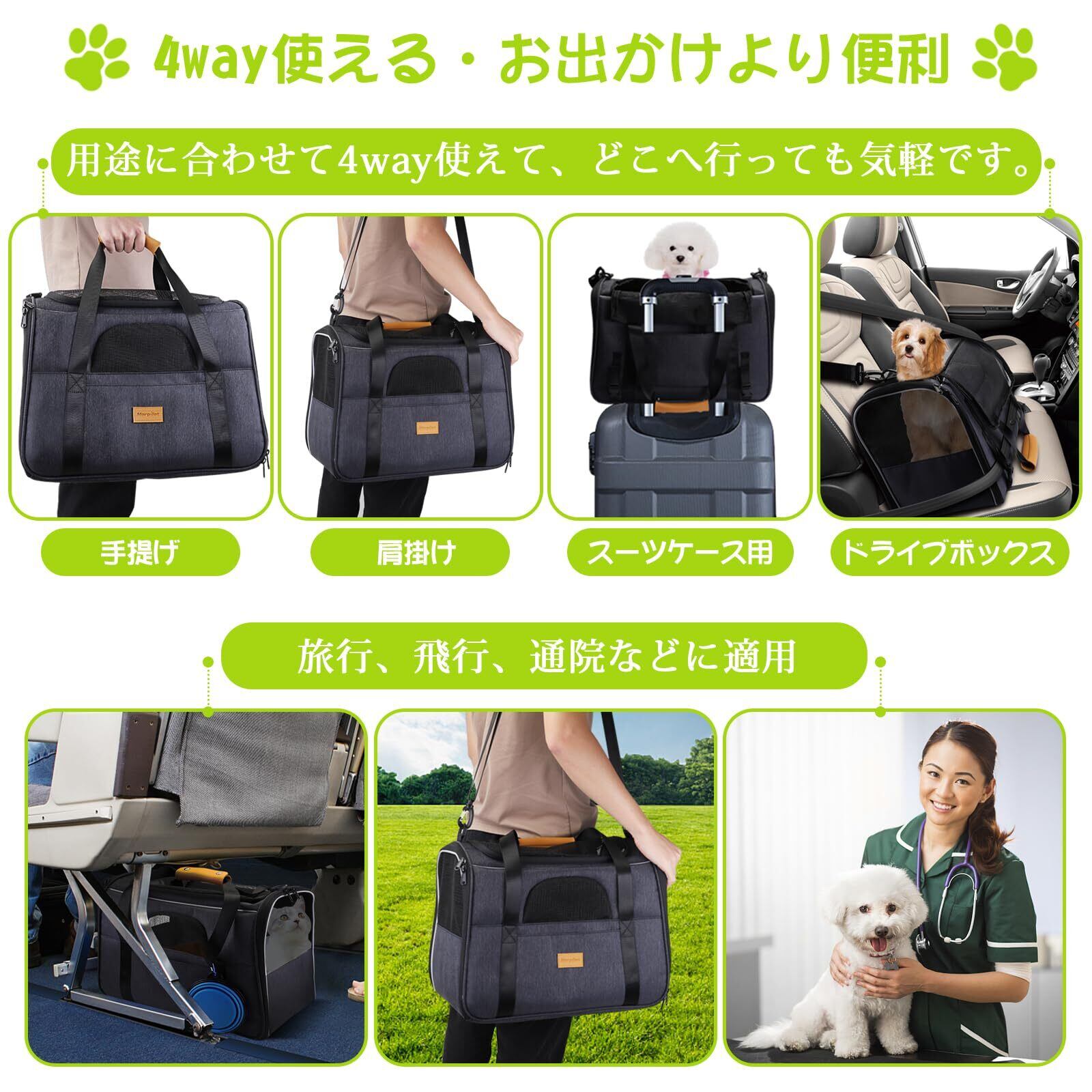 【4way使える・お出かけ便利】ペットキャリーバッグは調節可能なショルダーストラップが付属していて、手提げ、肩掛け、ドライブボックス、スーツケース用、4way使える手提げキャリーバッグです。 片側にはペットのスナックやおもちゃを置くのに使えるポケットがある。どこへ行っても気軽になり、お出かけやお散歩や旅行にとても素敵です。