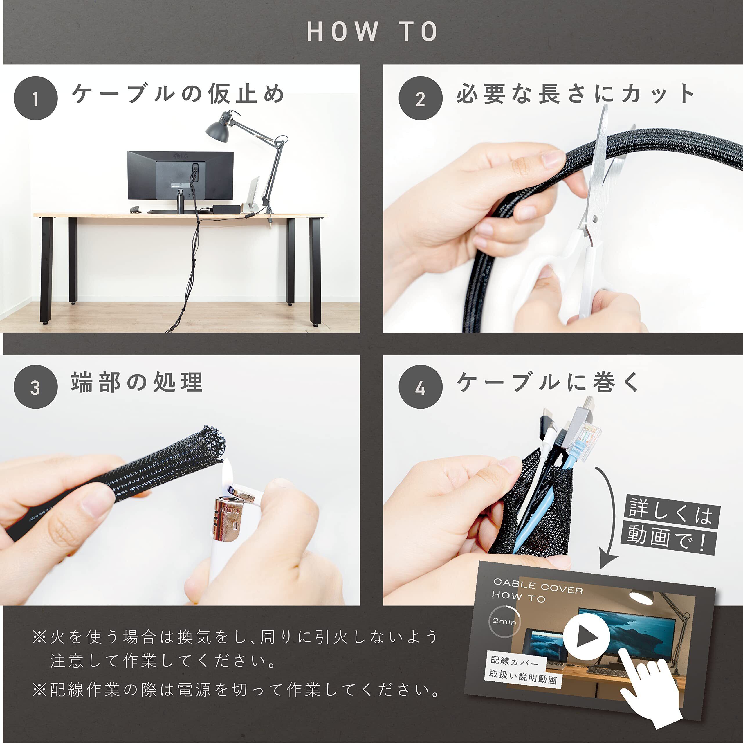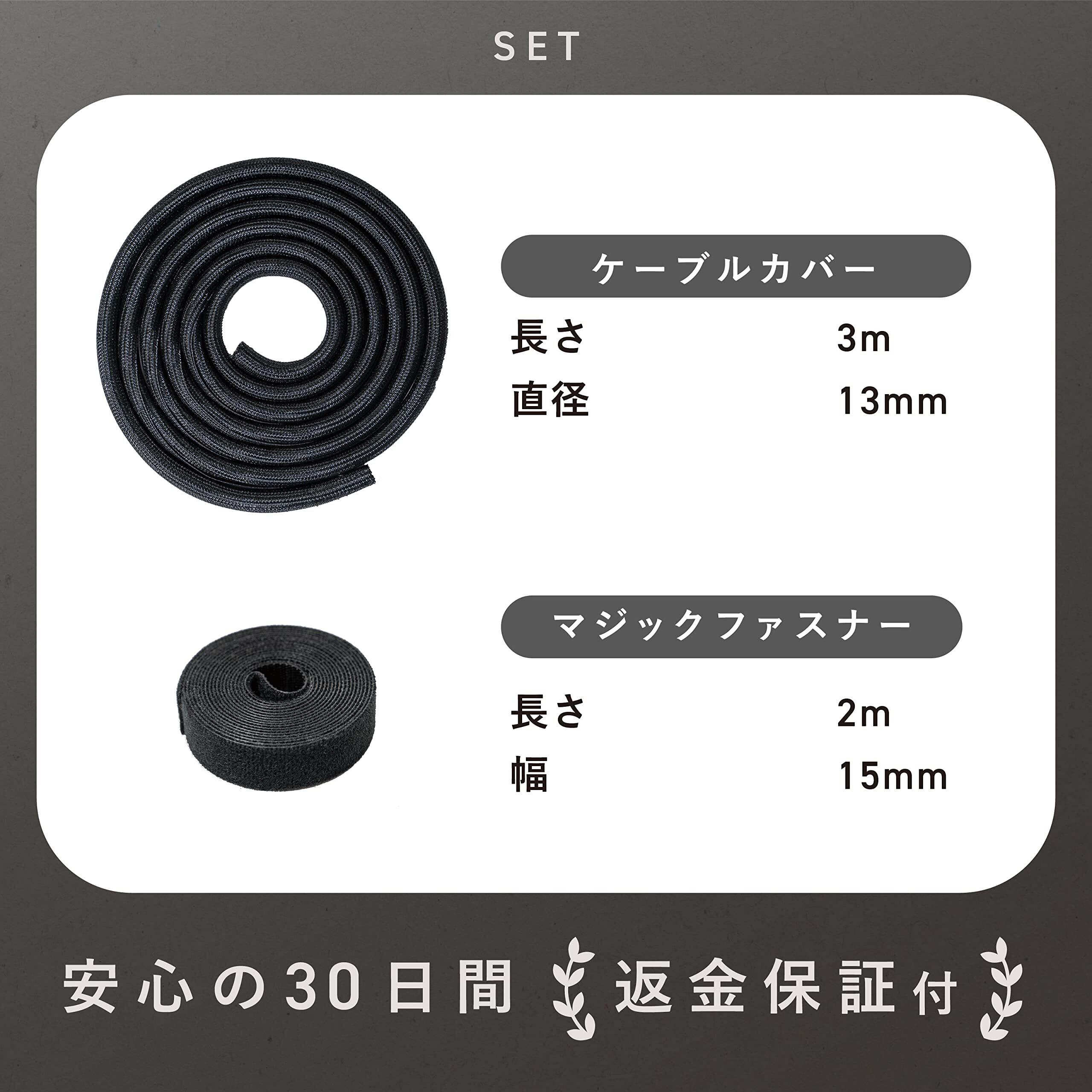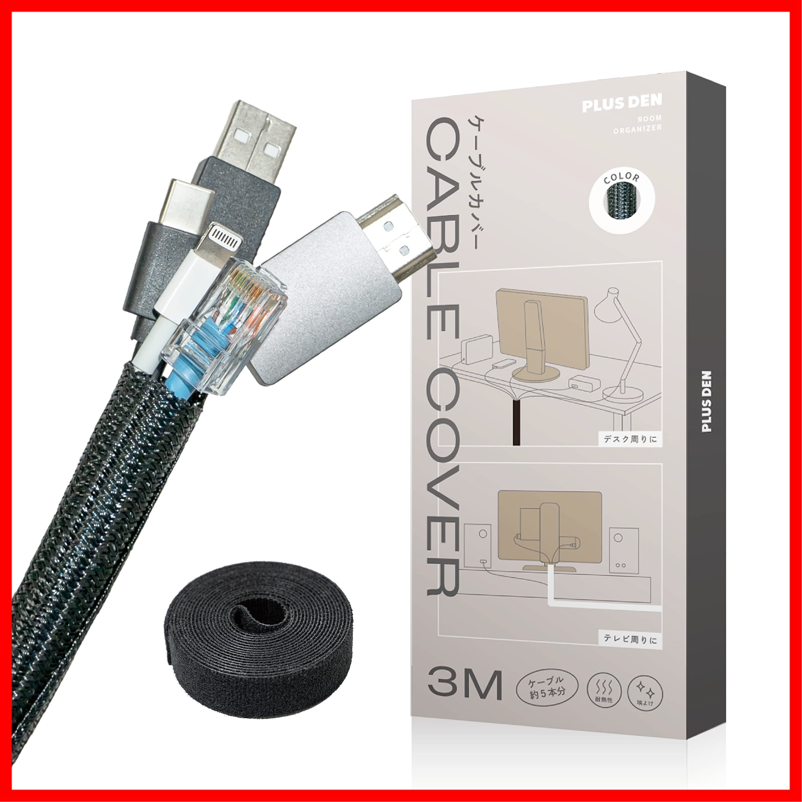PLUSDEN (プラスデン) ケーブルカバー 【一本でミニマルデスク】結束バンド付き (黒, 3m)