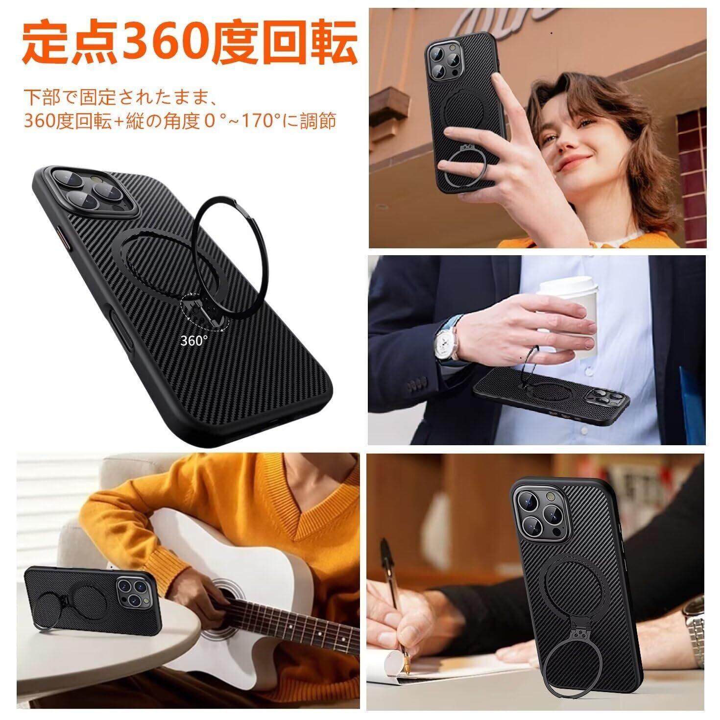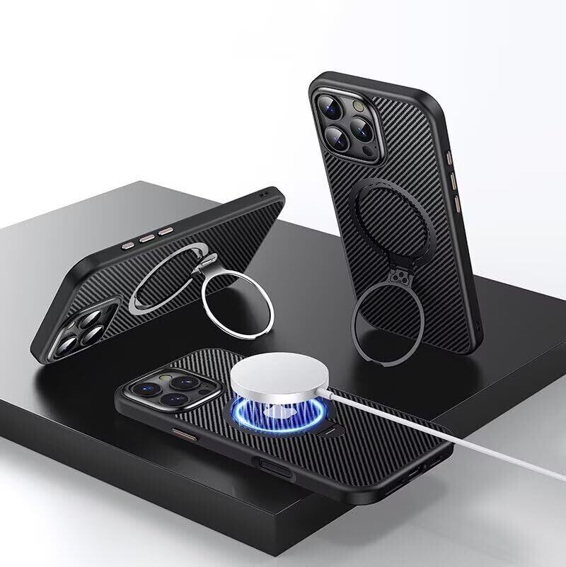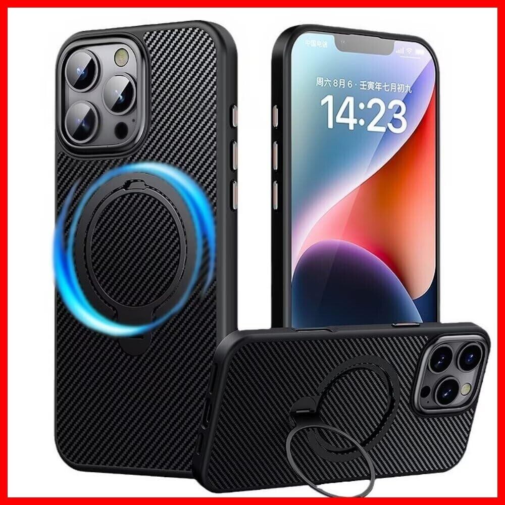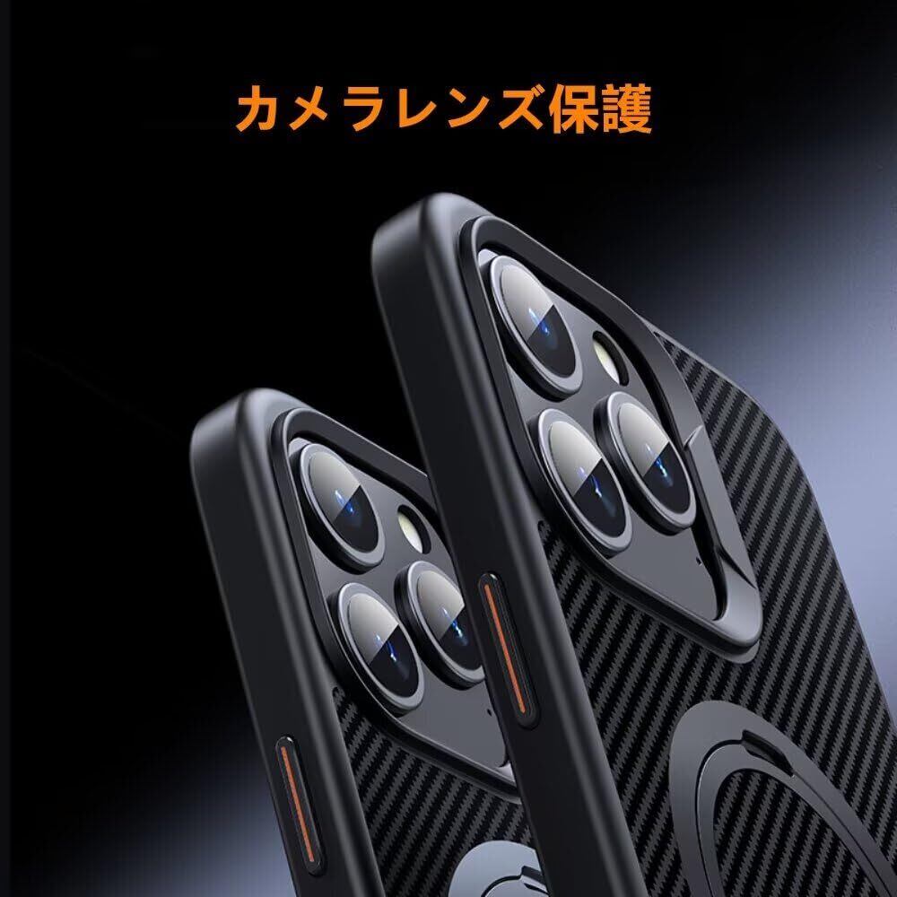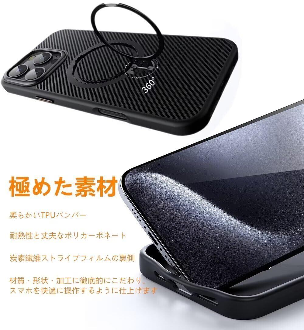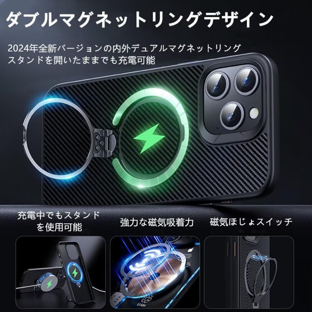 2024新開発 ダブルリング搭載・定点360度回転スタンド iphone 用 16 Pro ケース 隠し収納式スタンド MagSafe対応 縦横両立 角度調整 炭素繊維スト スマホ アイホン16pro用ケース 耐衝撃 指紋防止