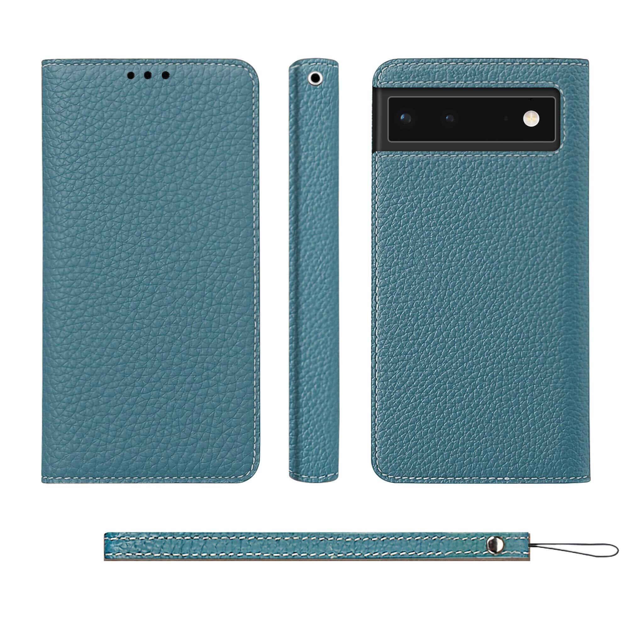 CLICSUN Google Pixel 6a 対応ケース 高級 牛本革 Pixel 6a 対応ケース 手帳型 グーグル ピクセル 6a 対応カバー 本革 レザー カバー 全面保護 衝撃吸収 スタンド機能 ストラップ付き マグネット式 カードポケット ギフトボックス付き ブルー×グレー | hananoki