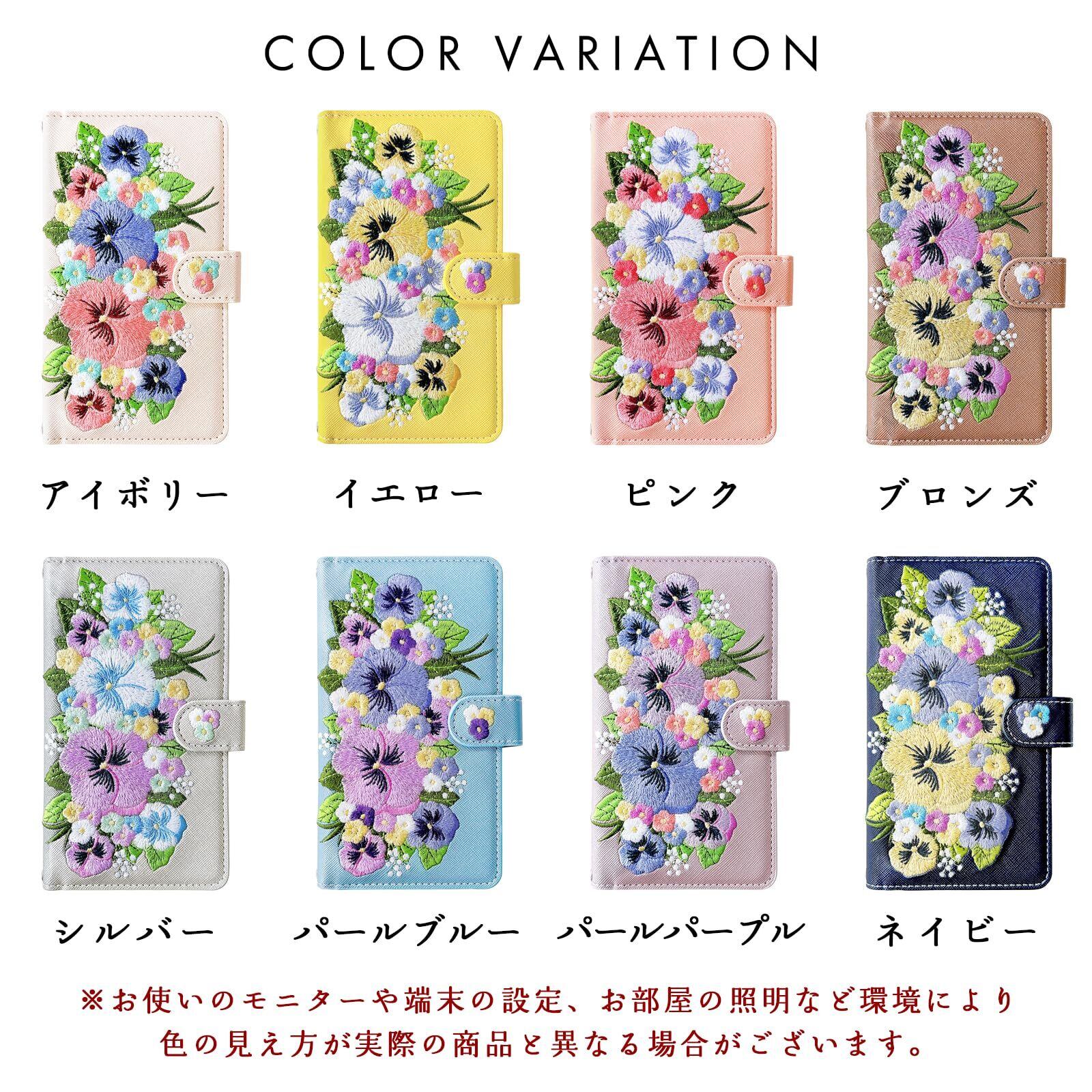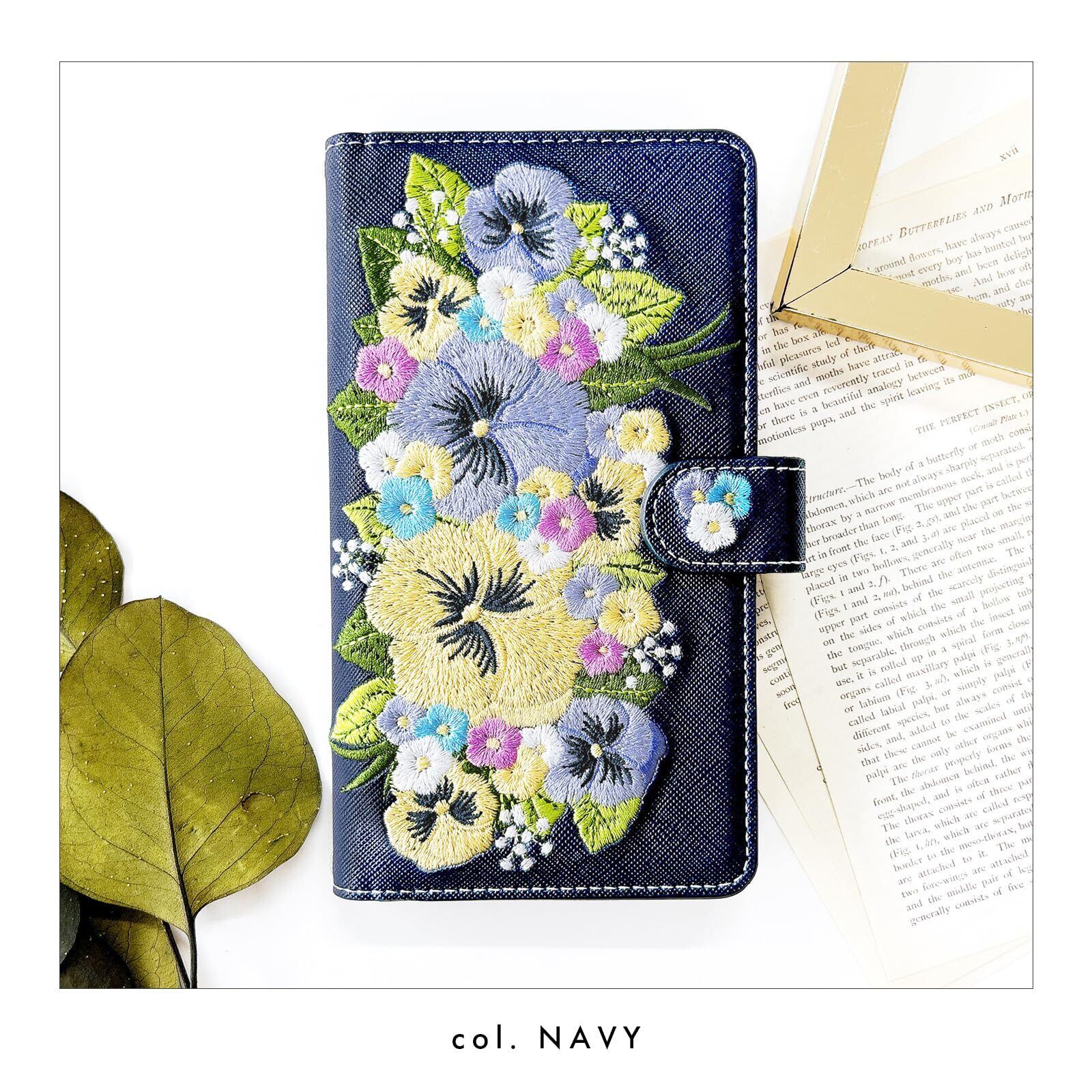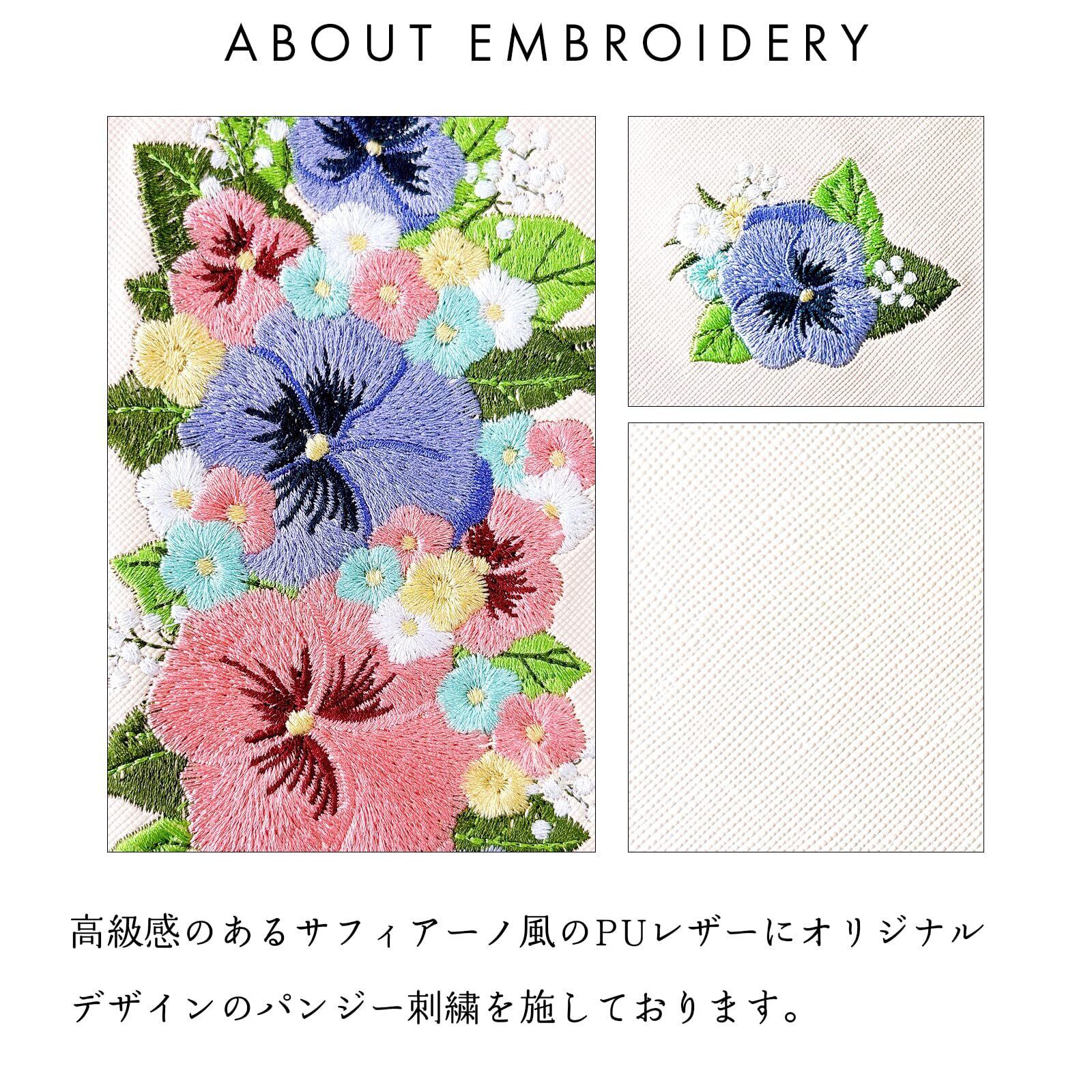 内側にはカードなどが収納できるポケット付きの、実用的なハンドあり手帳型ケースです。高級感のあるサフィアーノ調生地に華やかで上品なオリジナルデザインのパンジー刺繍を施しています。ストラップ穴付きのため、チェーンを付けたりストラップを付けることが可能となります。