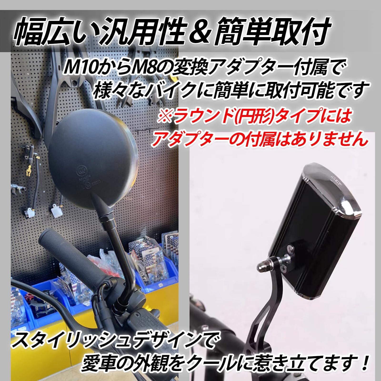 【簡単取り付け】M10からM8の変換アダプターが付属しているため、※円形タイプにはアダプターの付属はありません。さまざまなバイクに簡単に取り付け可能です。これにより、カスタマイズの自由度が高まり、個々のバイクに最適なミラーを装着できます。
