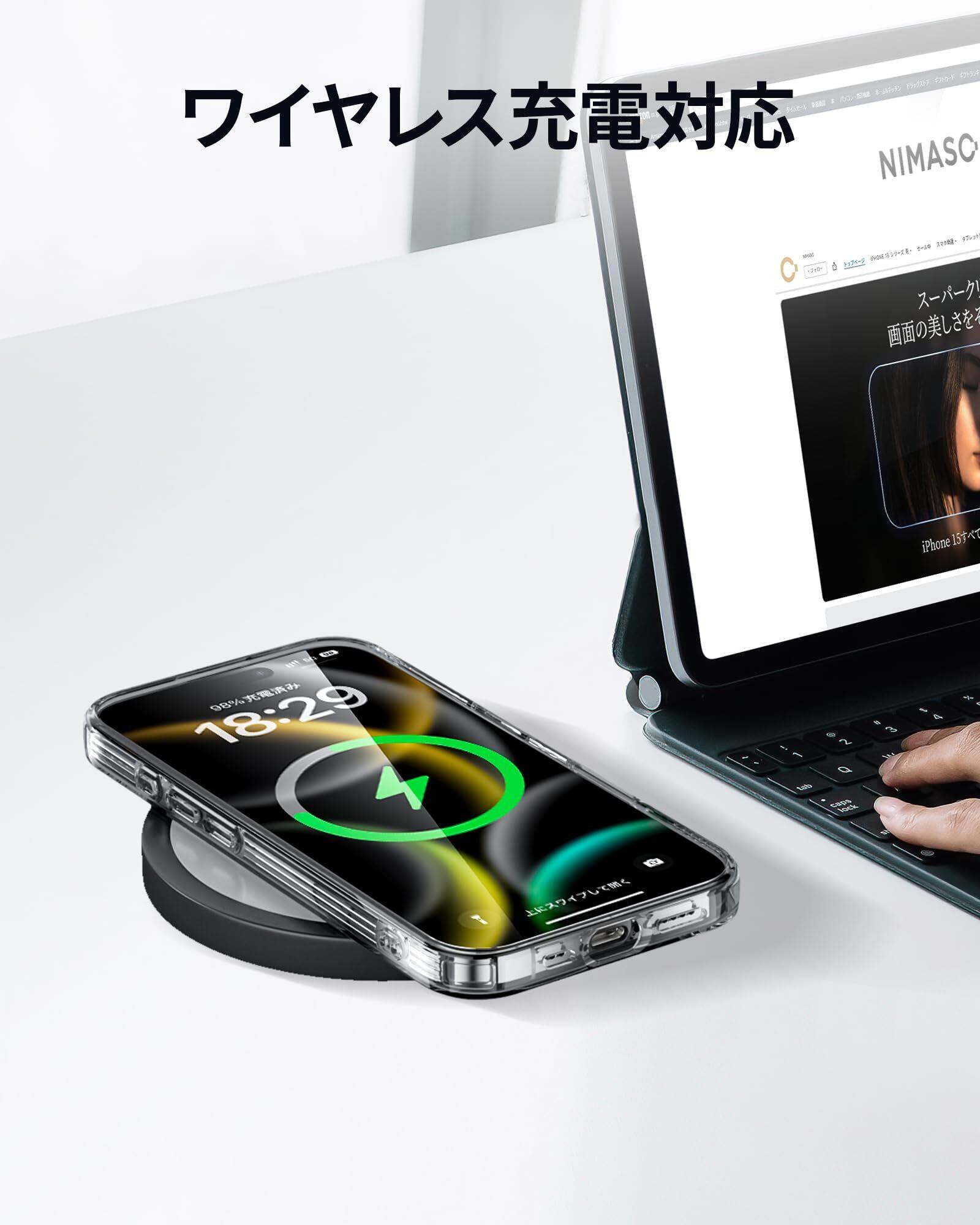 【ワイヤレス充電対応】薄型で軽量の仕様。ケースを装着したままワイヤレス充電ができる。精巧なカットアウトによって、ボタン操作も快適です。(本製品はMagSafe機能が付いていないので、MagSafe充電器を使う場合、スマホケースに磁力がないため、ピタッとくっつかない事がございますので、ご注意ください。)